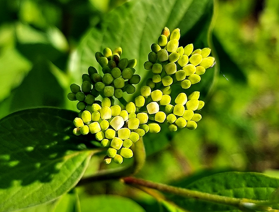취산꽃차례에 달린다. 꽃잎은 4장이고 타원형이며 흰색이다. 열매는 핵과이고 둥글며 검게 익는다.