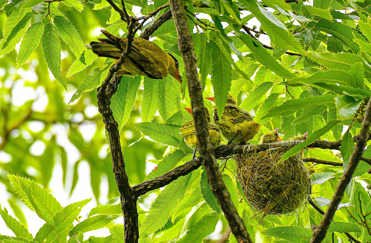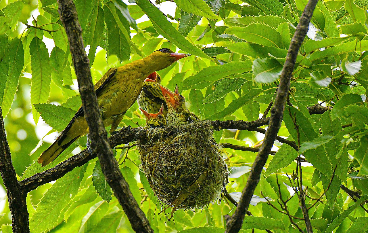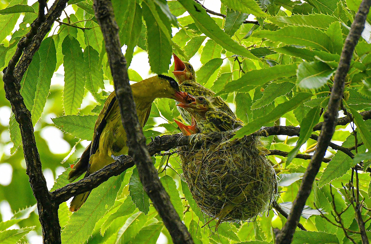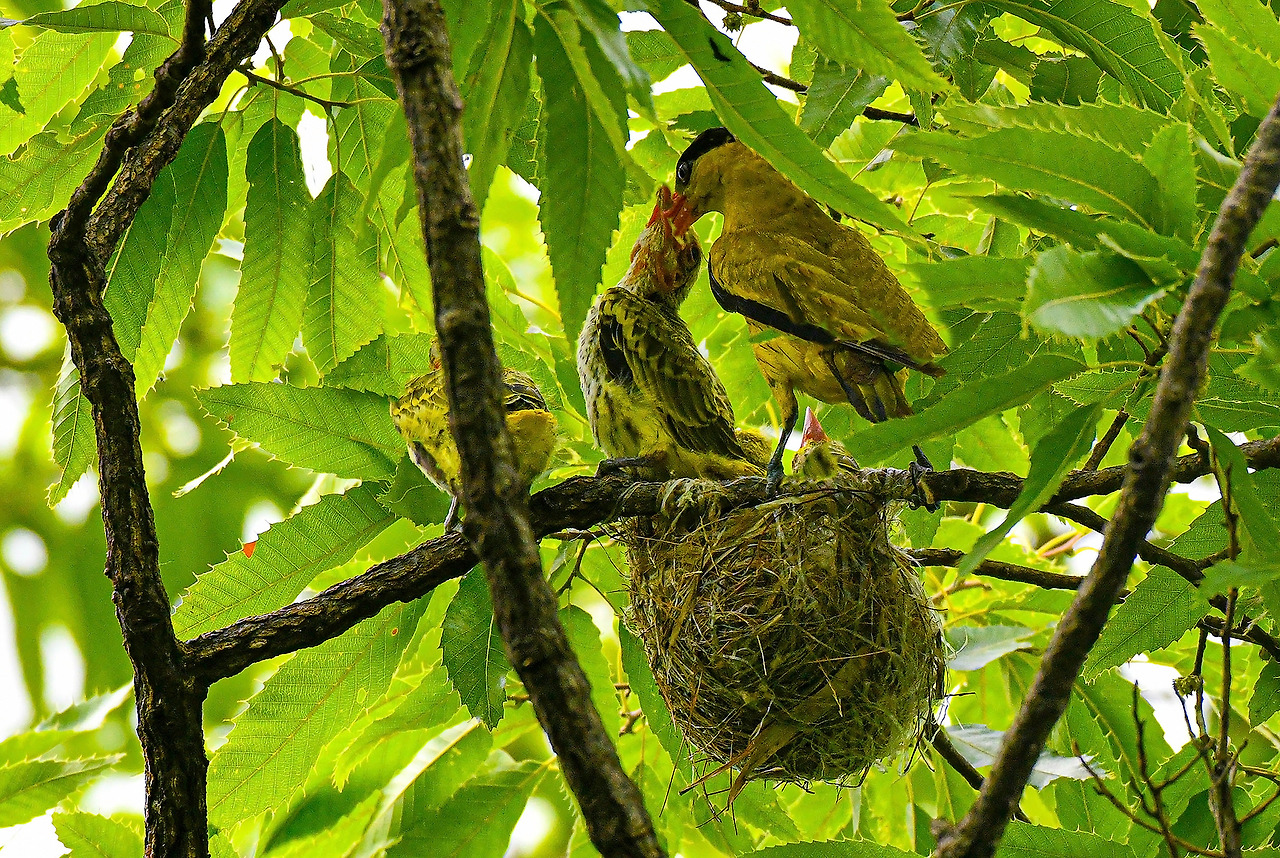 둥지도 높은 나무 꼭대기에 만들기 때문에 무성한 나뭇잎과 줄기에 가려서 육추 모습의 촬영은 더욱 쉽지가 않다.