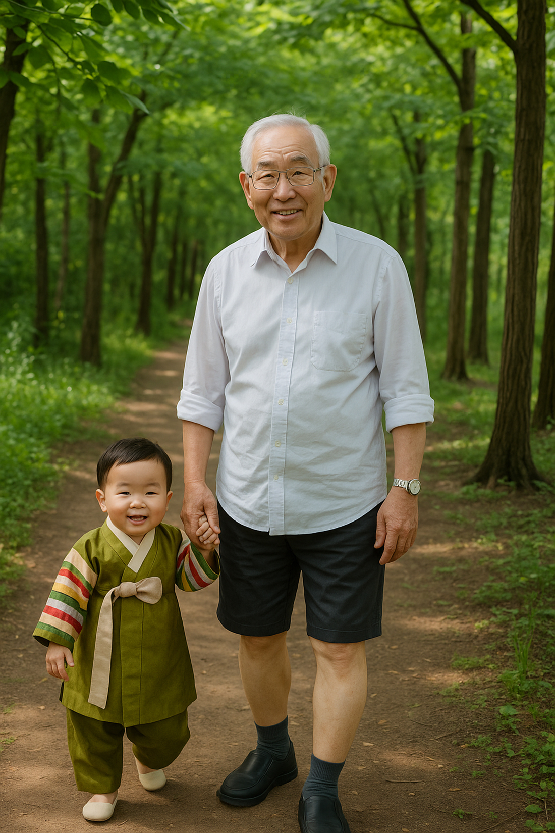 이 2장 사진을 참조하여 현재의 내가 88년 전의 나와 함께 숲속 오솔길을 산책하는 모습을 생성해보고 싶습니다..ㅎ