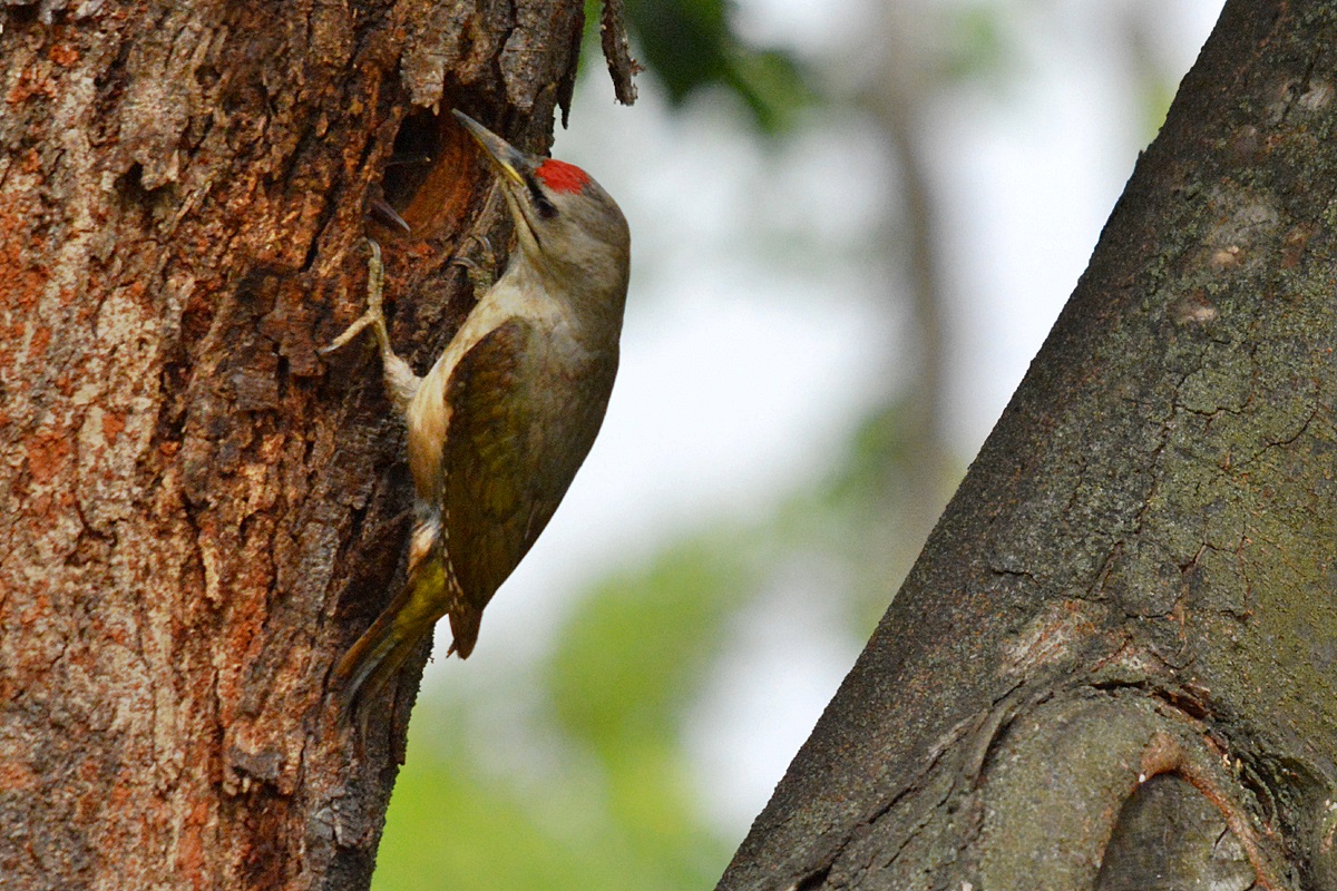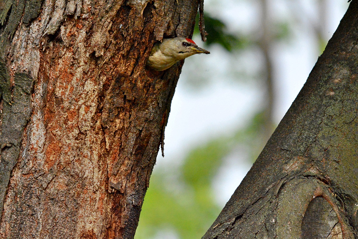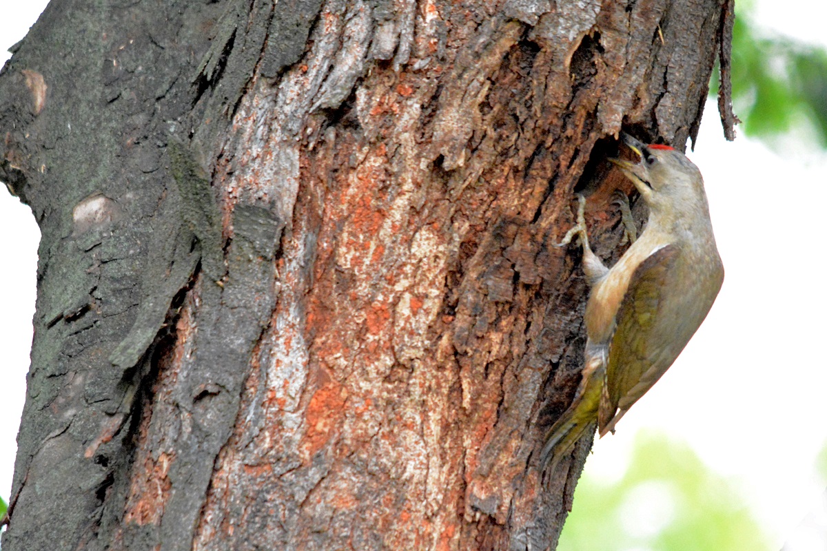 청딱따구리는 수컷은 머리 위에 붉은 반점이 있고 암컷은 없는 것이 다른 점이다.