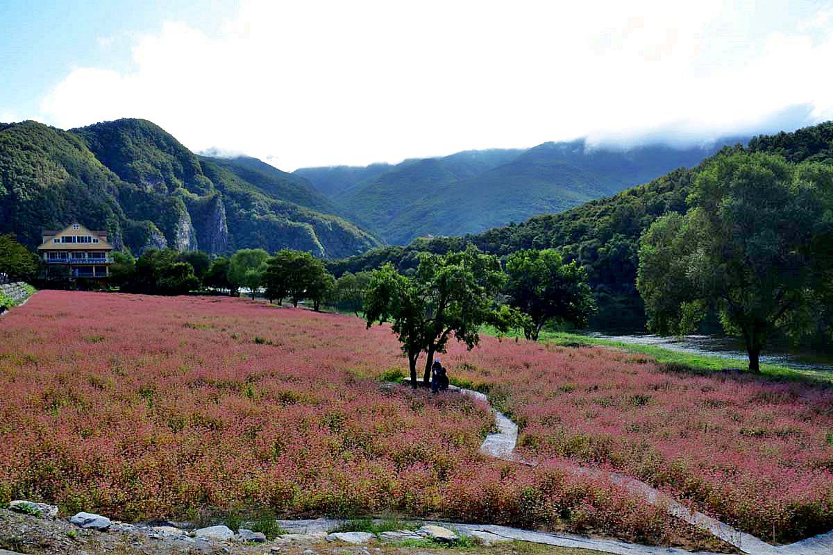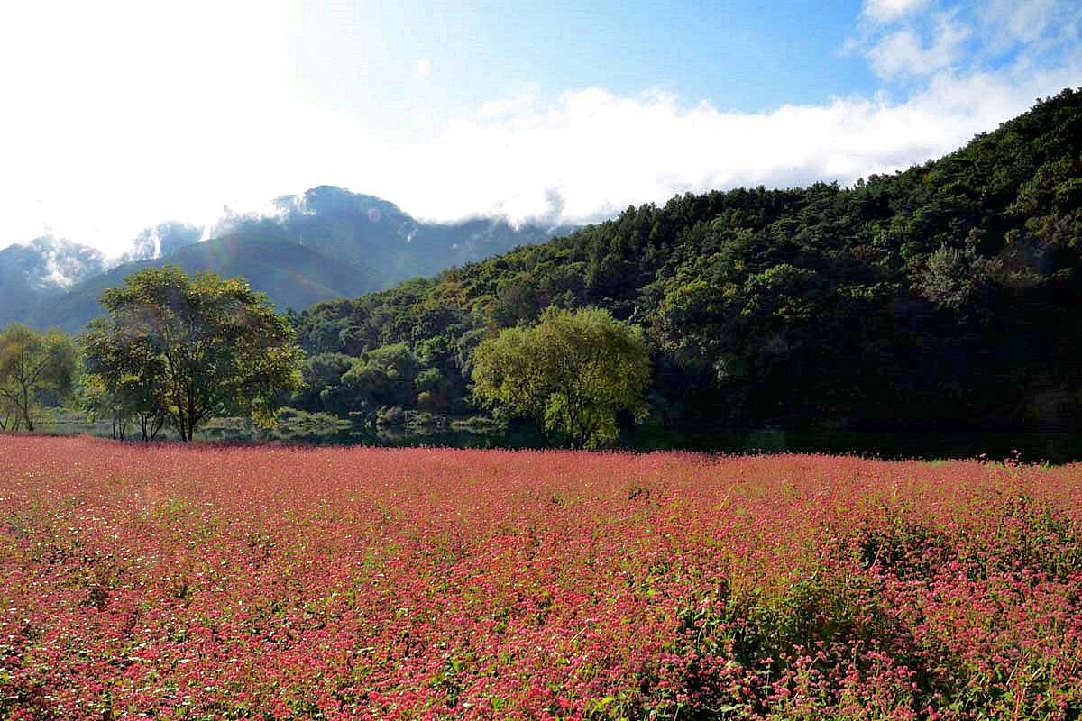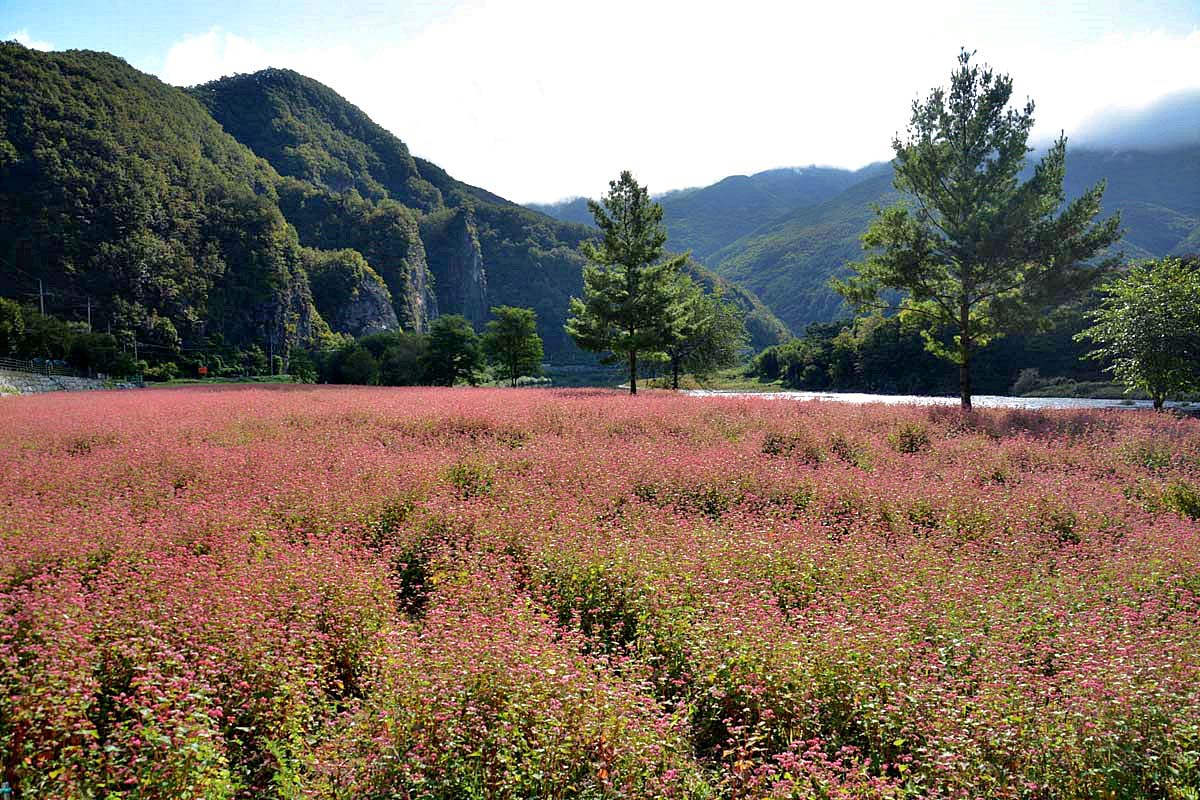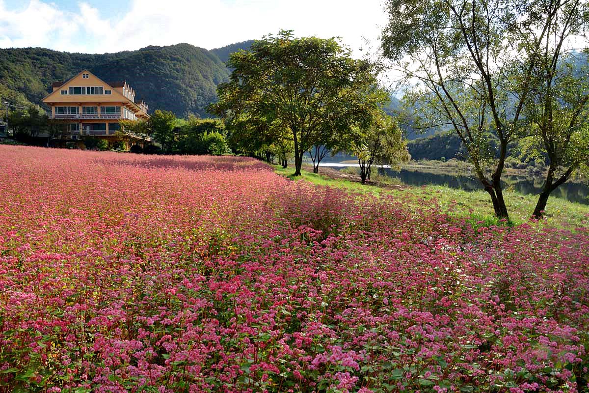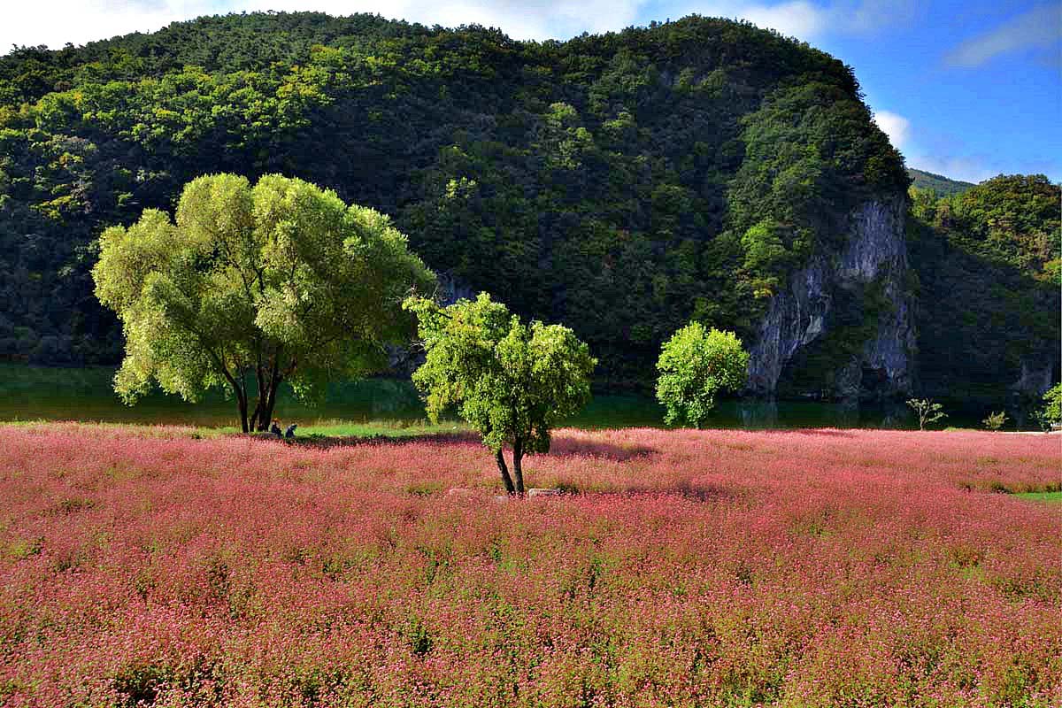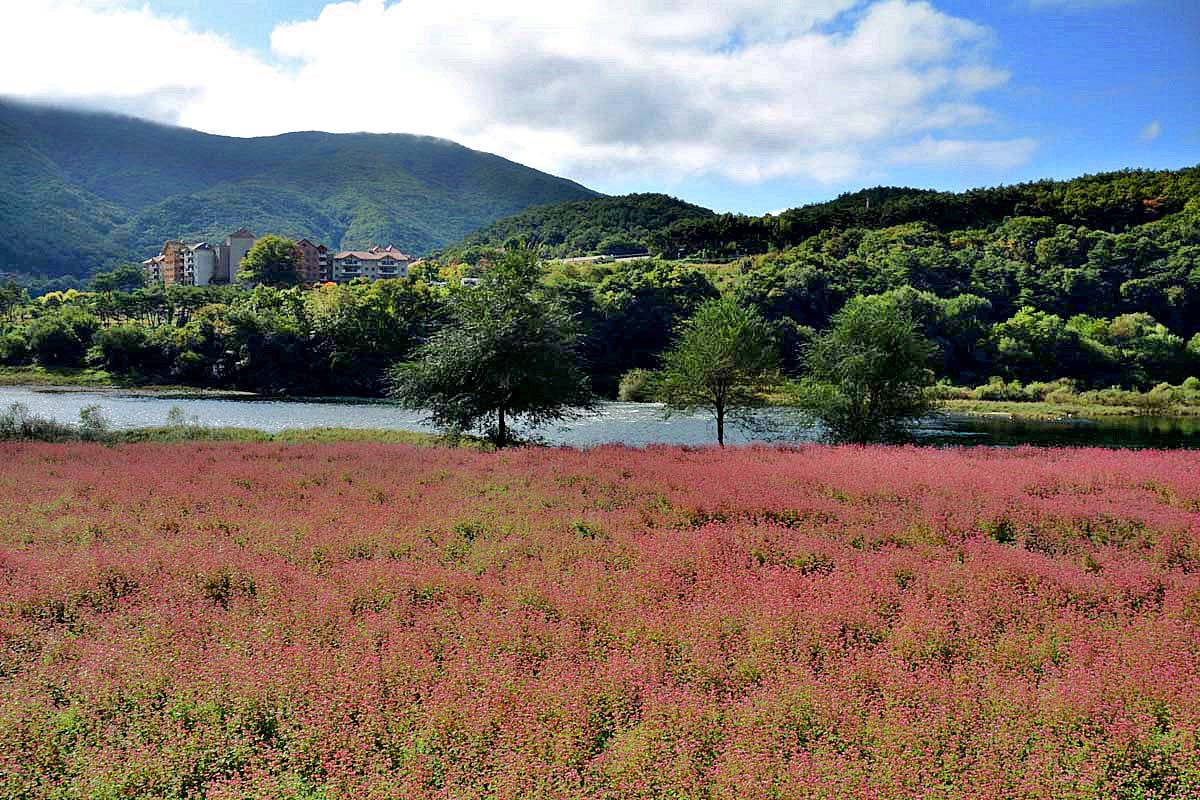 영월 심옥리 동강변에는 지금 붉은 메밀꽃이 흐드러지게 피어있다.