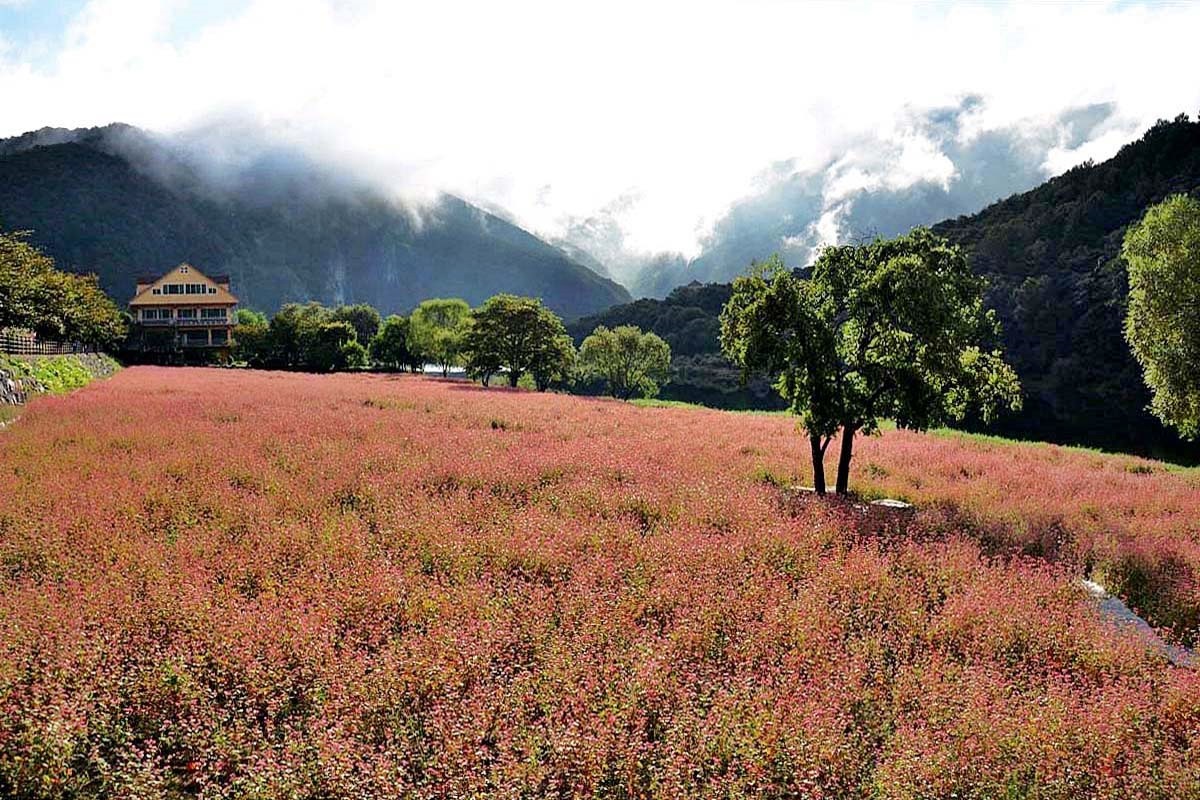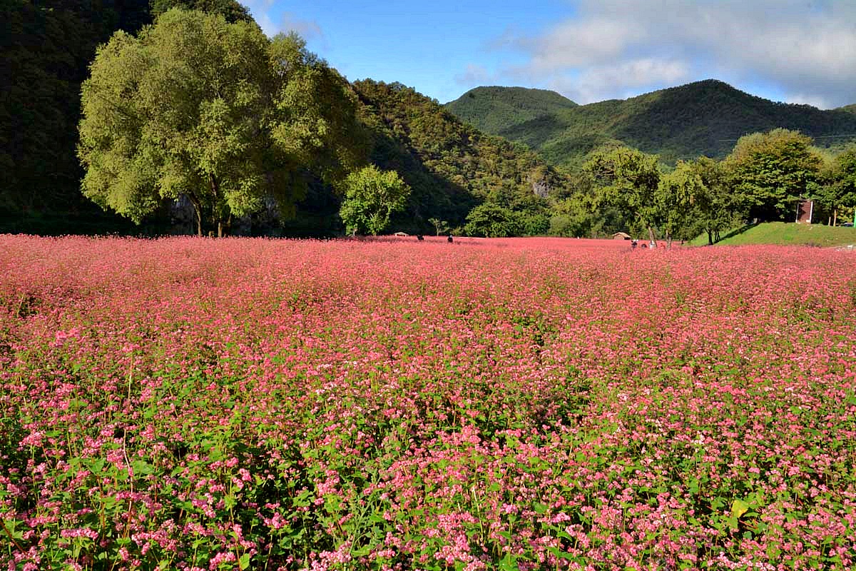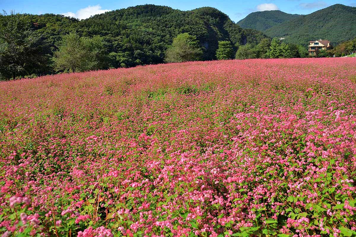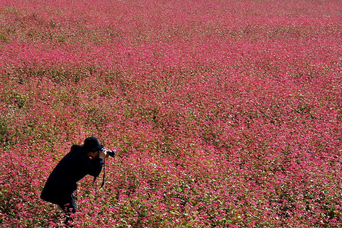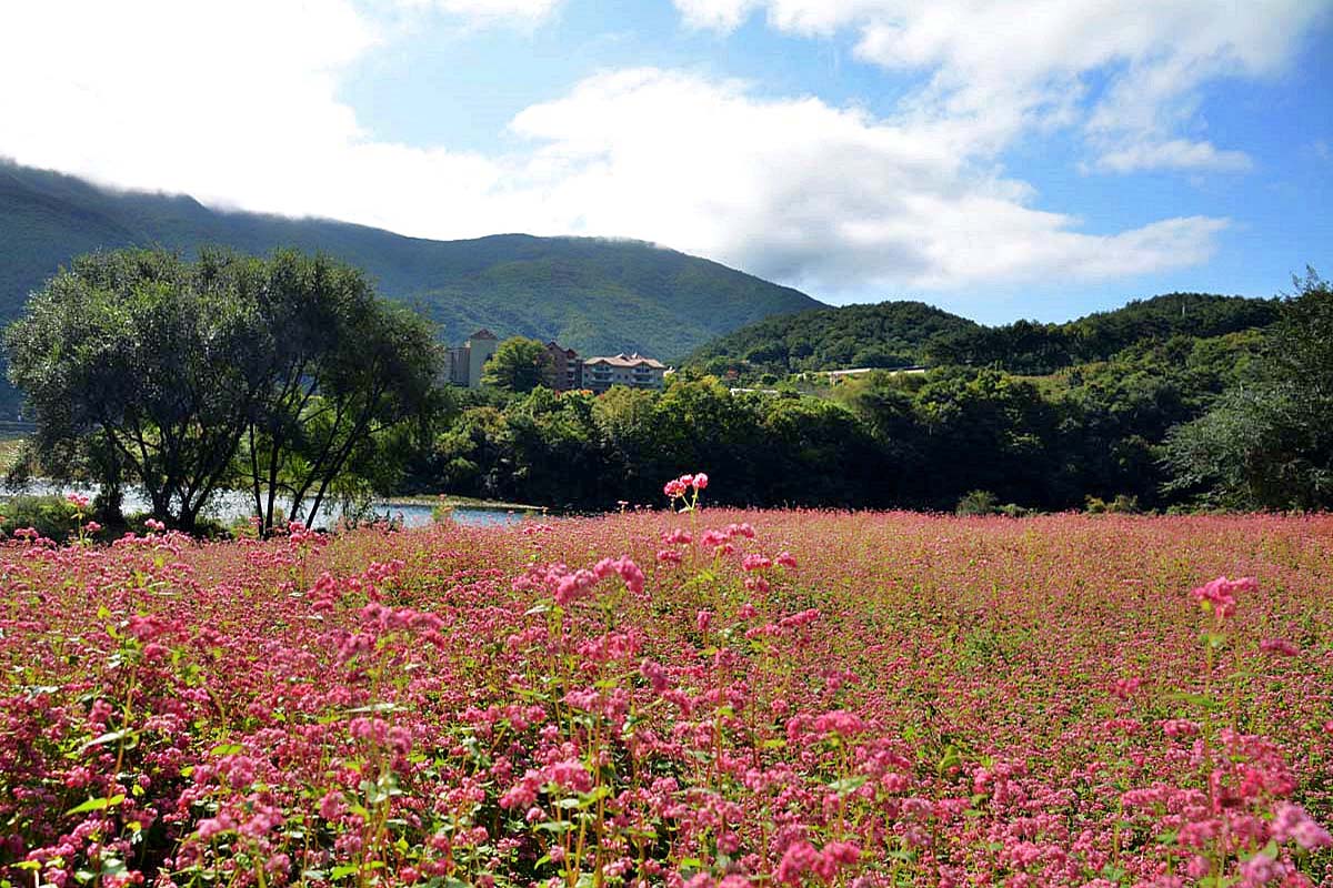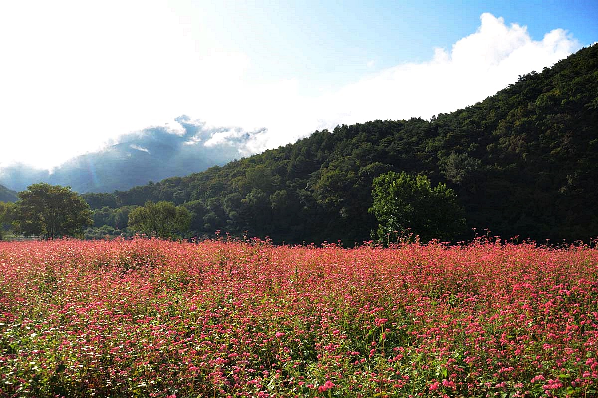 영월 심옥리 동강변에는 지금 붉은 메밀꽃이 흐드러지게 피어있다.