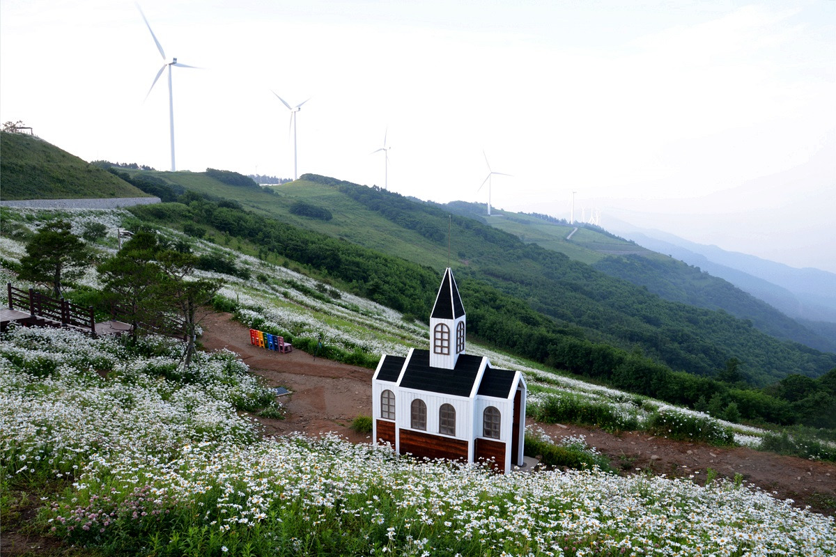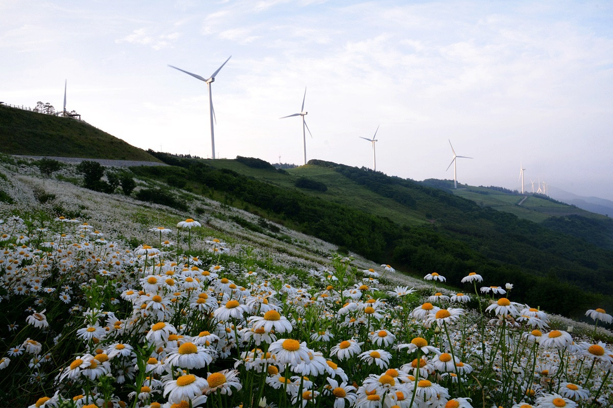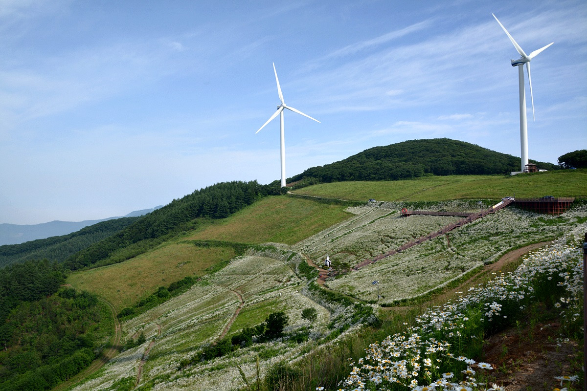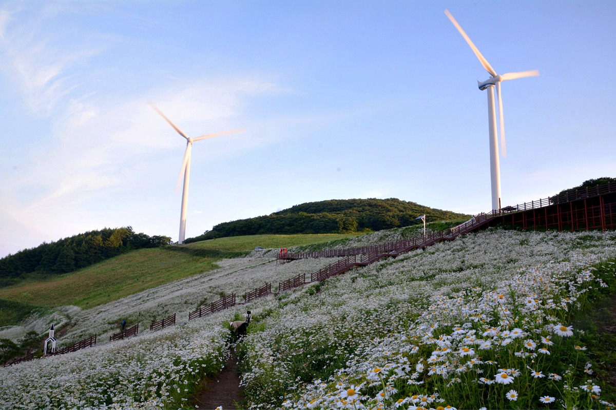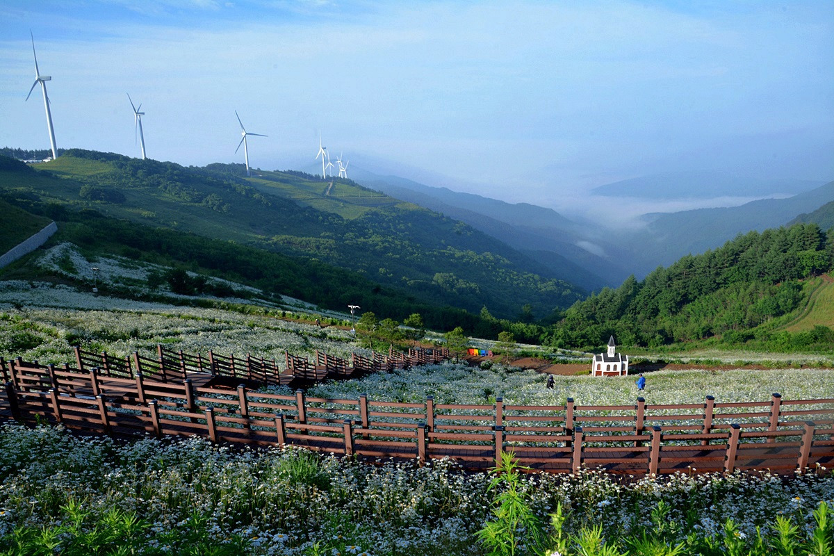 능선에 세워진 풍력발전기와, 운해와, 데이지꽃이 한데 어울어진 육백마지기 아침 풍경이 더없이 아름답다.