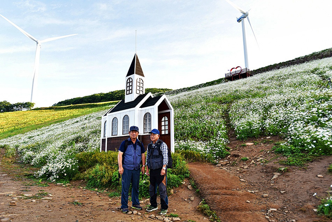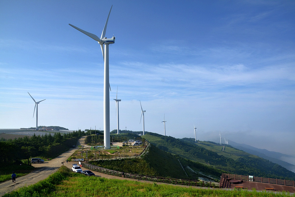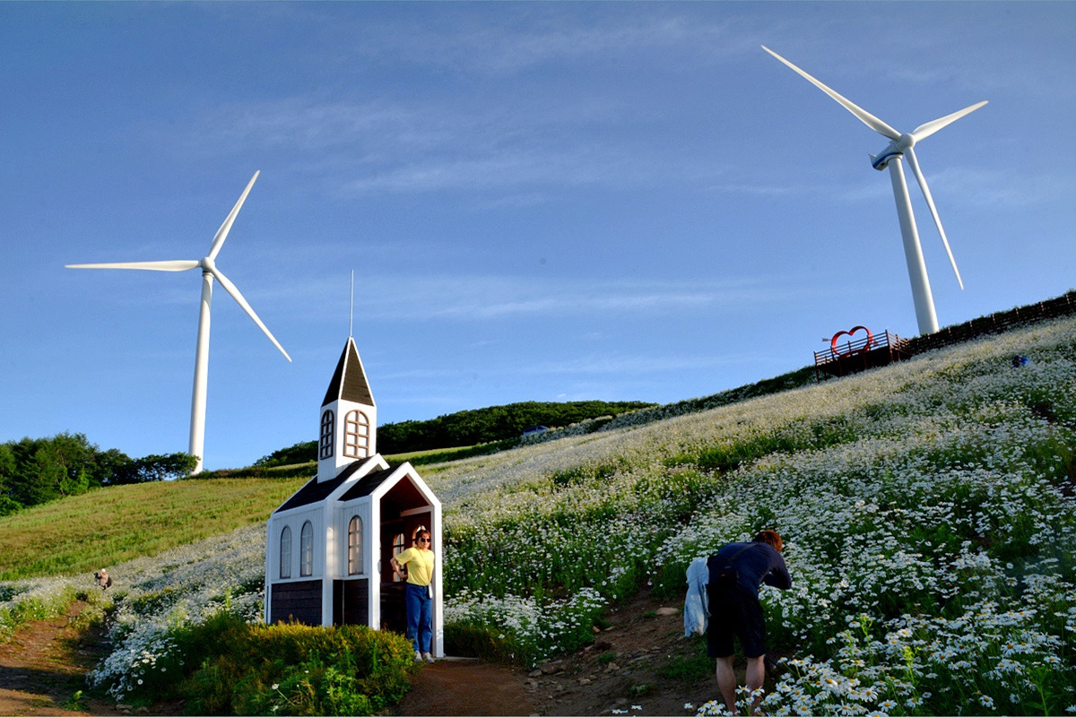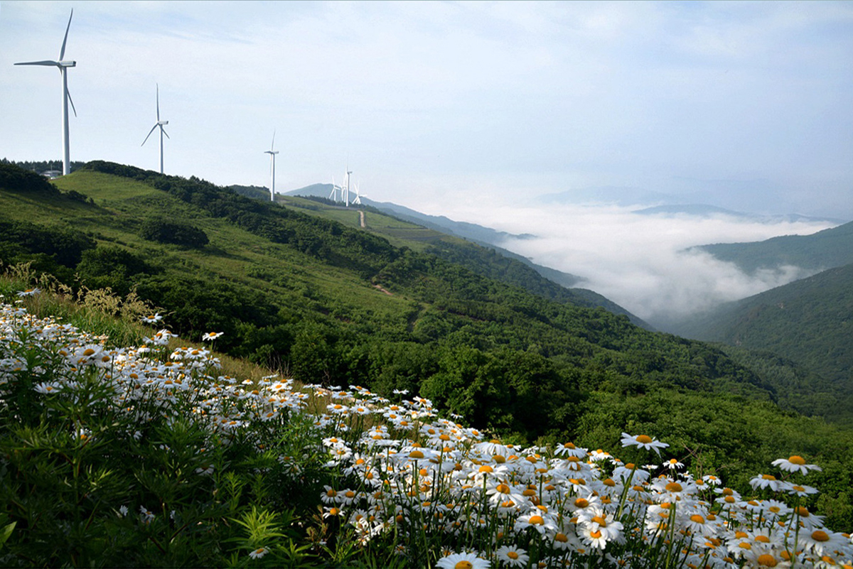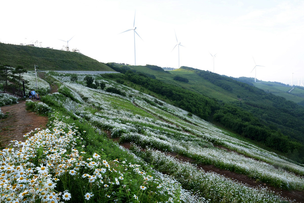 능선에 세워진 풍력발전기와, 운해와, 데이지꽃이 한데 어울어진 육백마지기 아침 풍경이 더없이 아름답다.