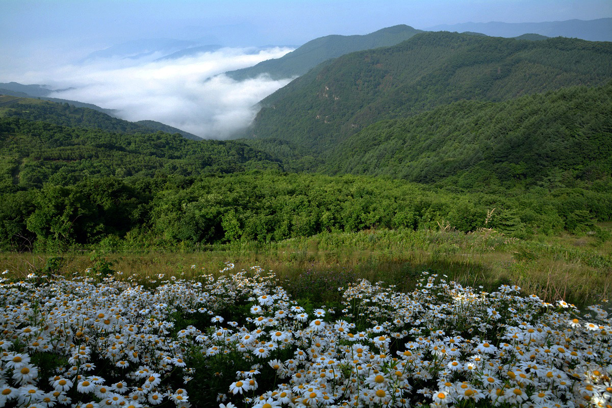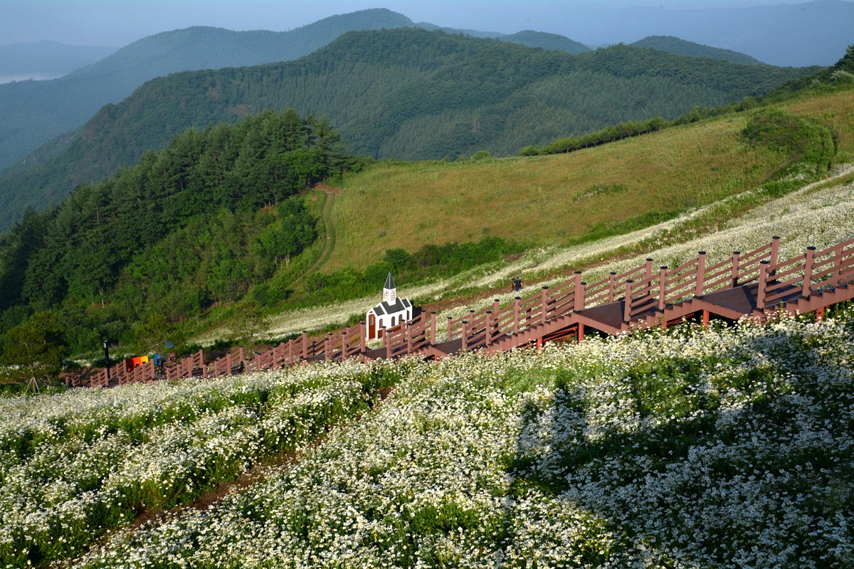 청옥산 육백마지기에 활짝 핀 샤스타 데이지 꽃(일명 여름구절초)이 마치 하얀 웨딩드레스를 입은 여인의