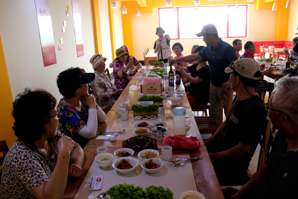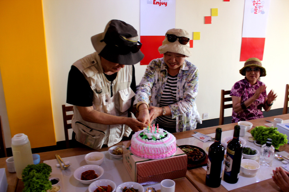 ▼ 여행기간중 생일을 맞은 가족대표를 회원들이 축하해주고 있다 ▼