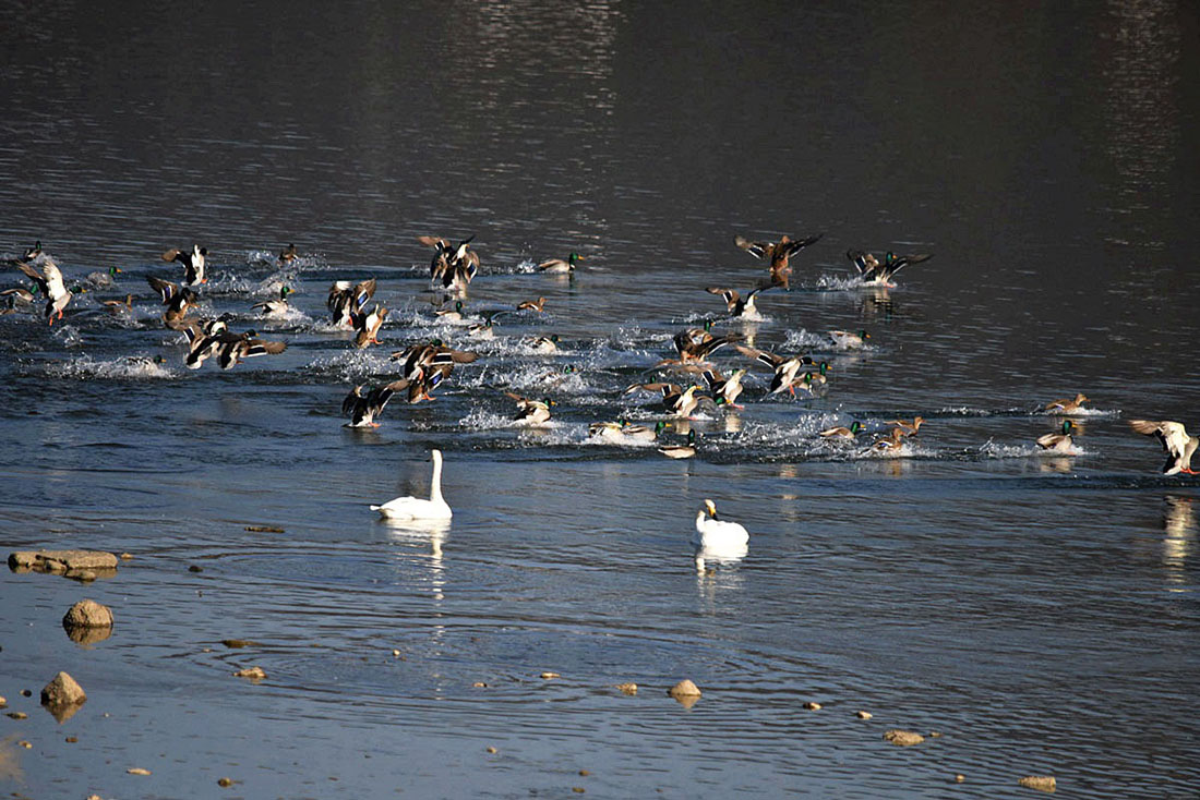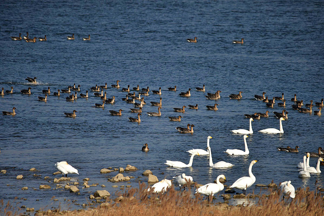 기러기, 오리등 철새들이 고니들과 뒤엉키어 활기찬 날개짓에 창공을 오르내리는 모습이 시선을 끌기에 충분하다