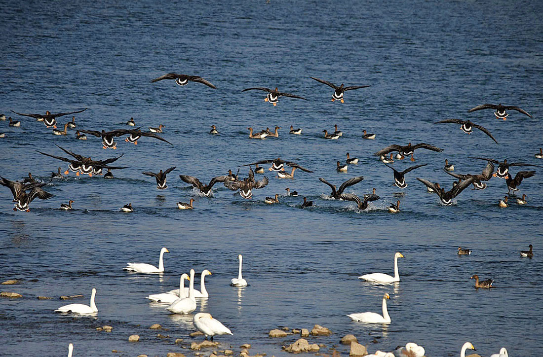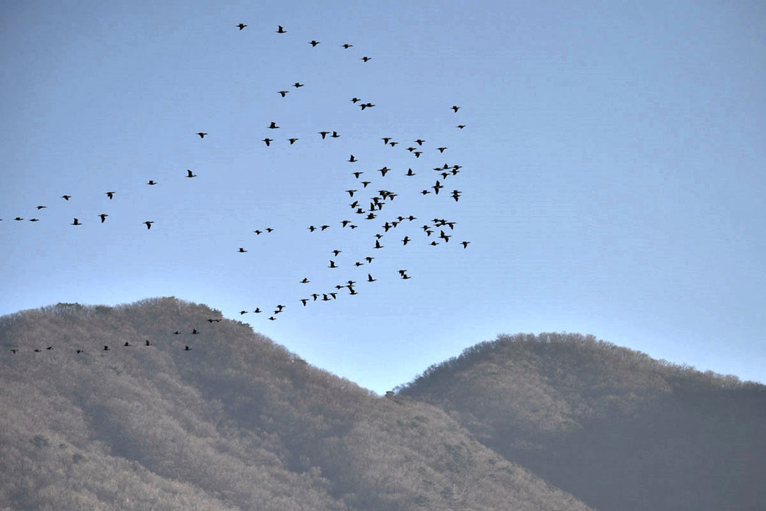 꼭 두루미나 고니같은 보호조가 아니더라도 기러기, 오리같은 다양한 철새들의 군무(群舞) 모습도 장관이다