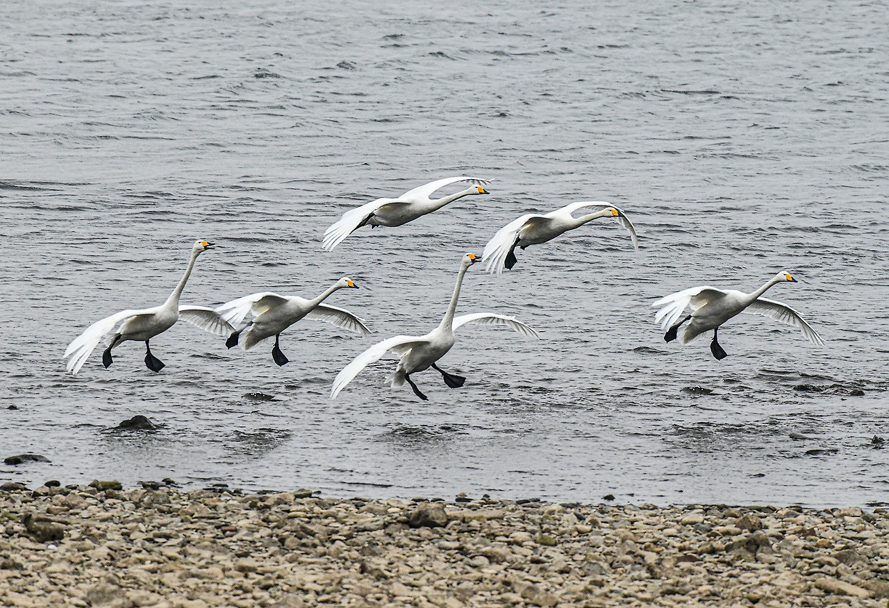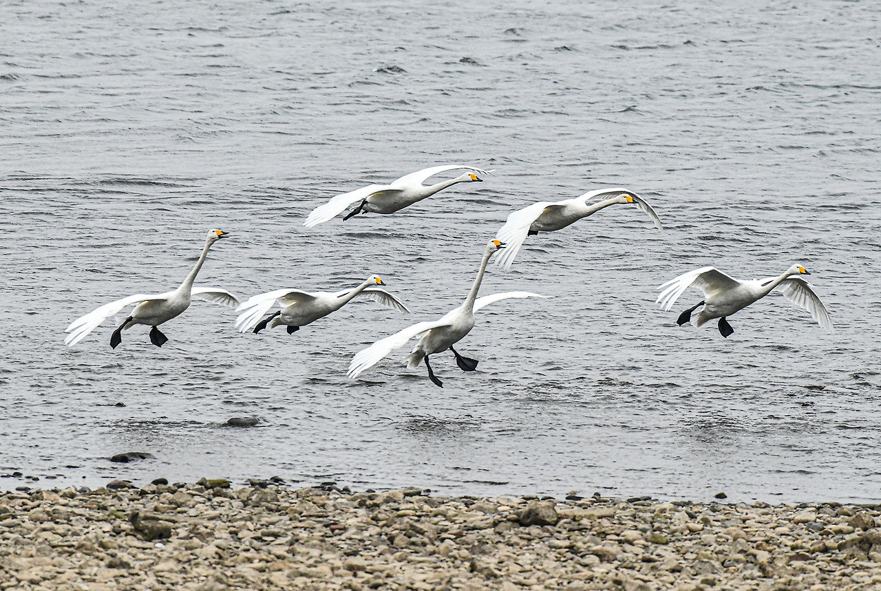두어시간 기다리니 차츰 시야가 트이면서 한 무리의 고니들이 망원렌즈 사정권내로 가까히 날아와 삼삼오오