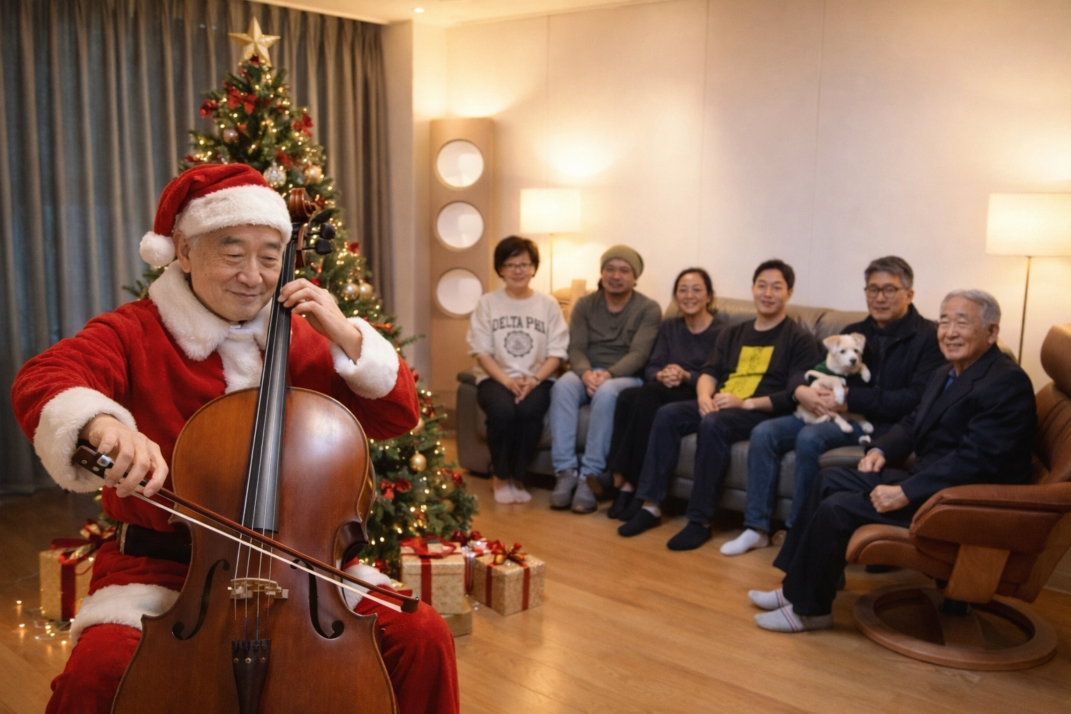 저희집 거실 트리 옆에서 제가 산타복장 비슷한 옷을 입고 첼로나 바이올린으로 가족들 환시리에