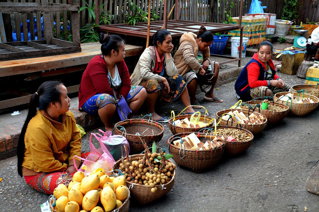 루앙프라방의 새벽시장, 노천에 좌판을 벌려놓고 각종 소채류와 열대과일, 메콩강에서 잡아올린 물고기등을