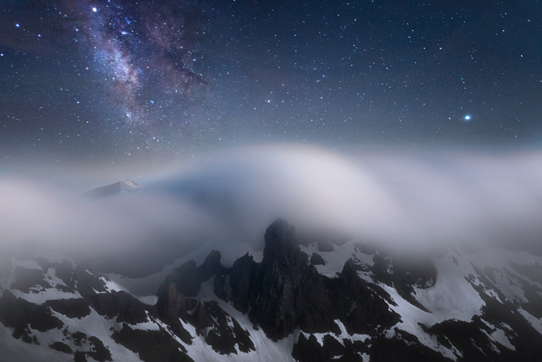 ▲ “Backstage shot” - 보름달이 뜬 밤에 France, Ecrins National Park의 Aiguille Dibona (3,131m)의 뽀족한 남면을 촬영하였음.