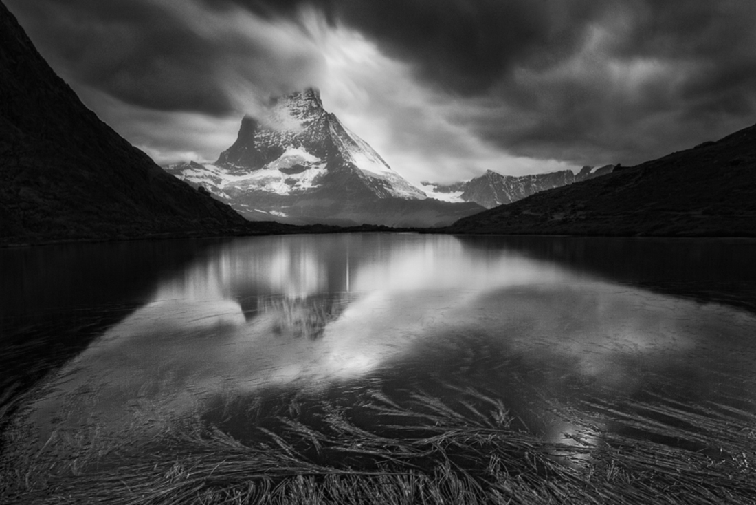 ▲ 이 야간 사진은 Riffelsee 호수 (2,757m)에서 땅거미 질 무렵에 찍은 것으로, Matterhorn이 두 덩어리의 큼직한 구름 사이에 보이고 있다.