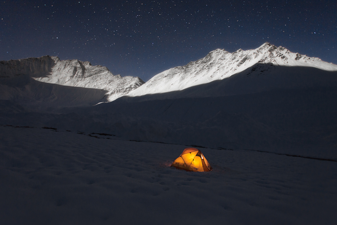 ▲ 한밤의 신비로운 분위기에 잠겨 있는 나의 텐트가 이태리 Val Maira의 Brec de Chambeyron 베이스 근처에서 마치 오팔처럼
