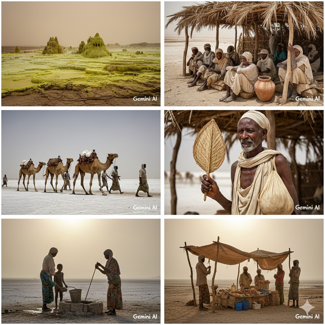 소금 채굴 : 사진에서 낙타가 짐을 싣고 가는 모습은 이곳의 유일한 경제 활동인 '소금 채굴'을 상징합니다.