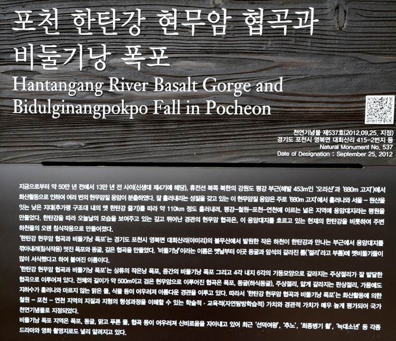 경기 포천 비둘기낭폭포는 포천시가 지정한 한탄강 8 경중에 하나로 약 27만 년전 용암 유출에 의해 형성된