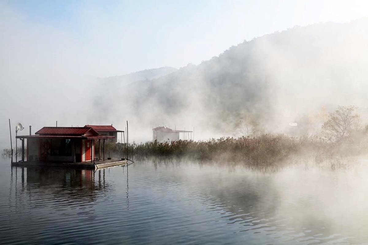 물안개 자욱히 피어오르는 만추의 새볔호숫가, 서서히 떠오르는 아침햇살이 노랗게 물든 은행나무와 물버들, 고사목이