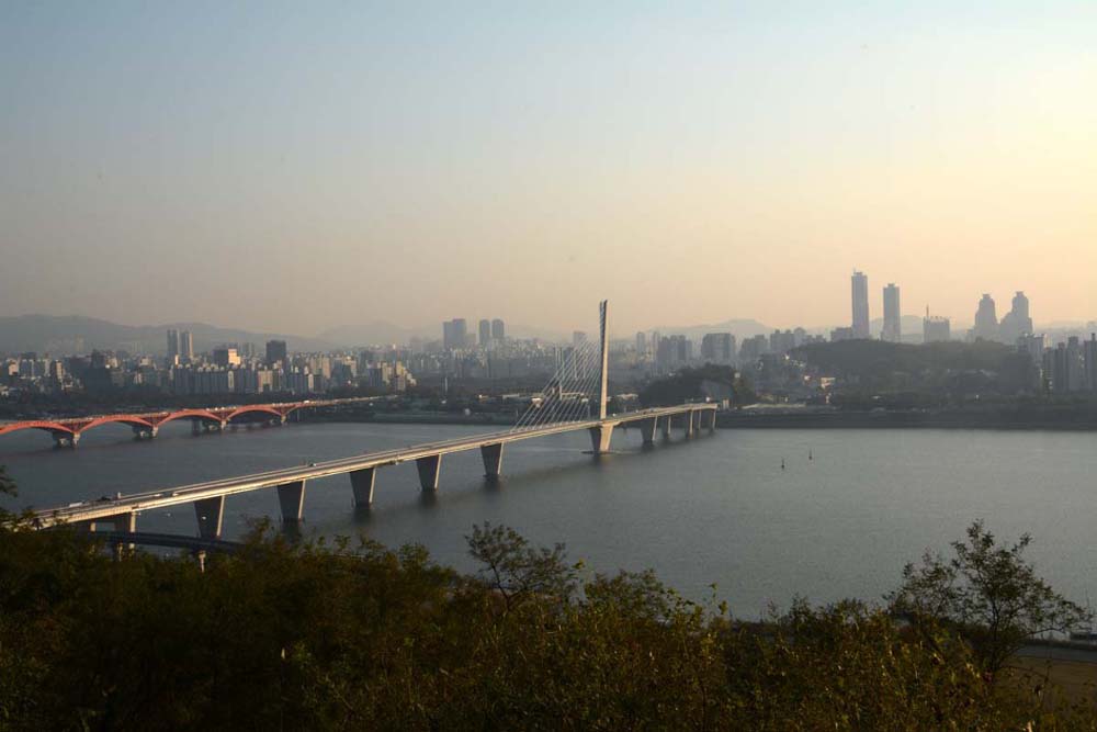 북쪽으로는 북한산, 동쪽으로는 남산, 남쪽으로는 한강, 서쪽으로는 행주산성이 보인다.