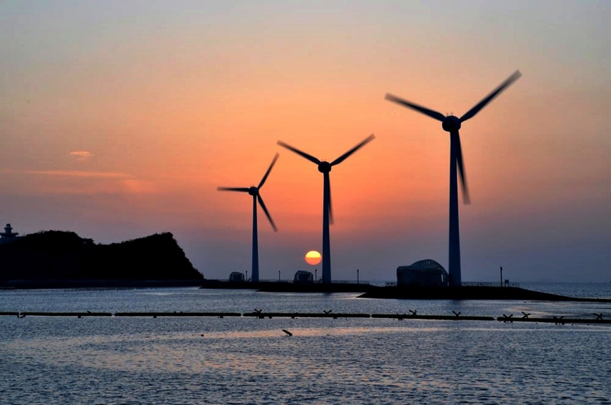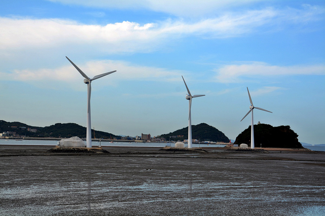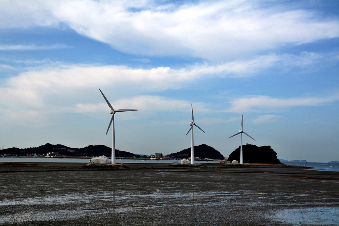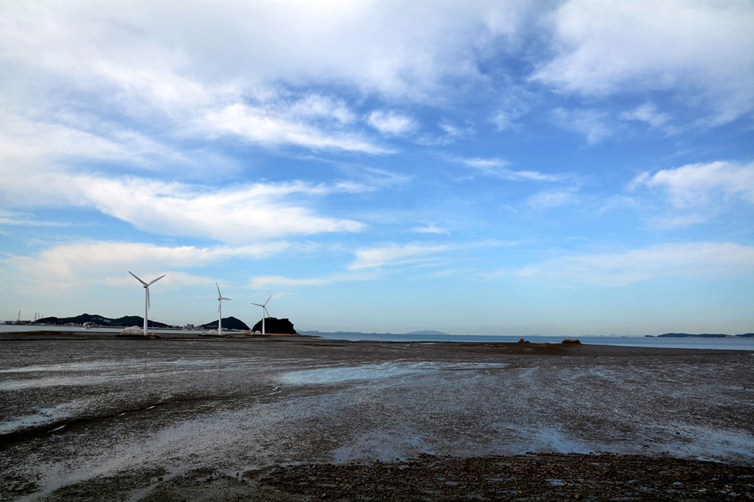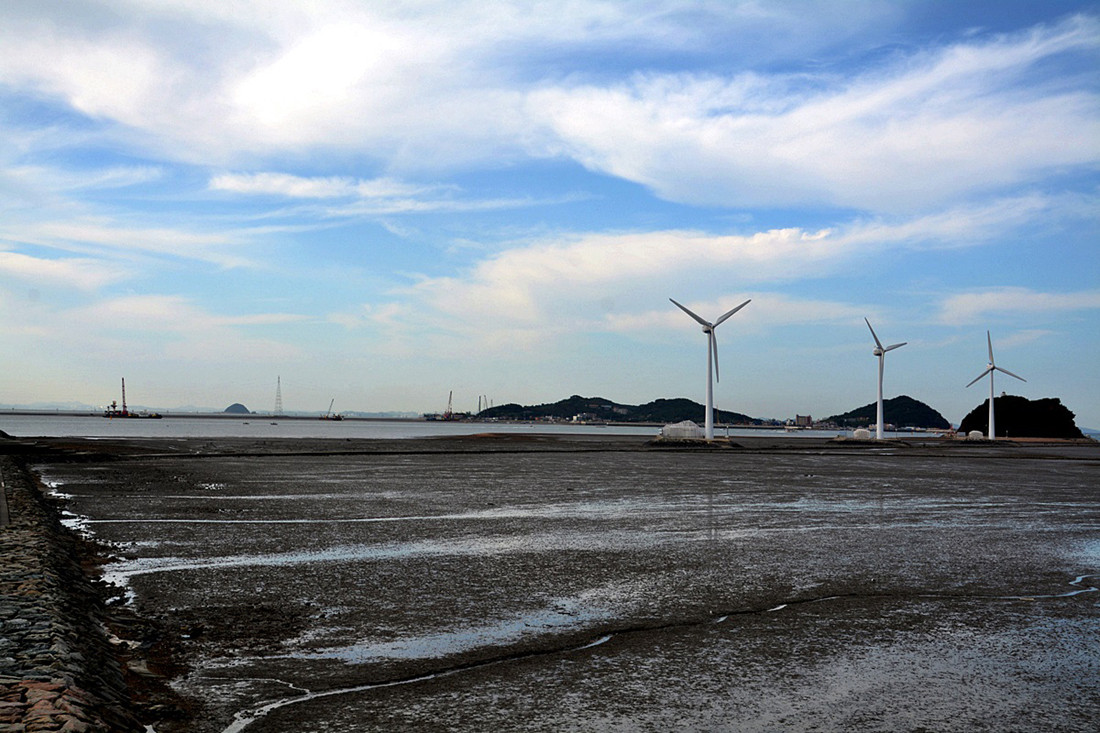 간조시간대 탄도항 모습, 썰물에 벌거숭이로 들어난 갯벌 위에 풍력발전기가 돌아가는 풍경,