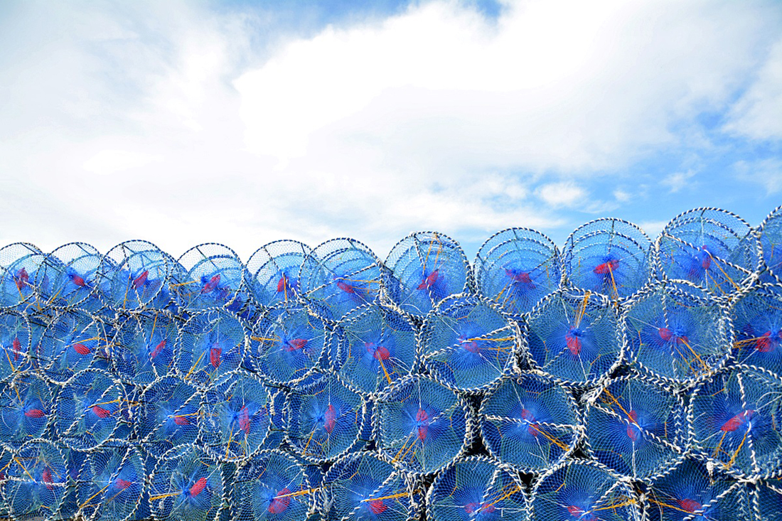 해변에 통발이 가지런히 쌓여있는 모습이 어민들의 삶의 터전임을 말해주며 정감있게 다가온다.