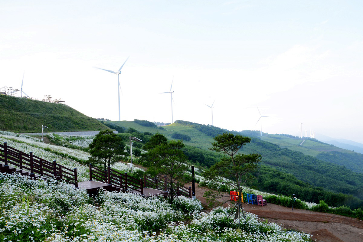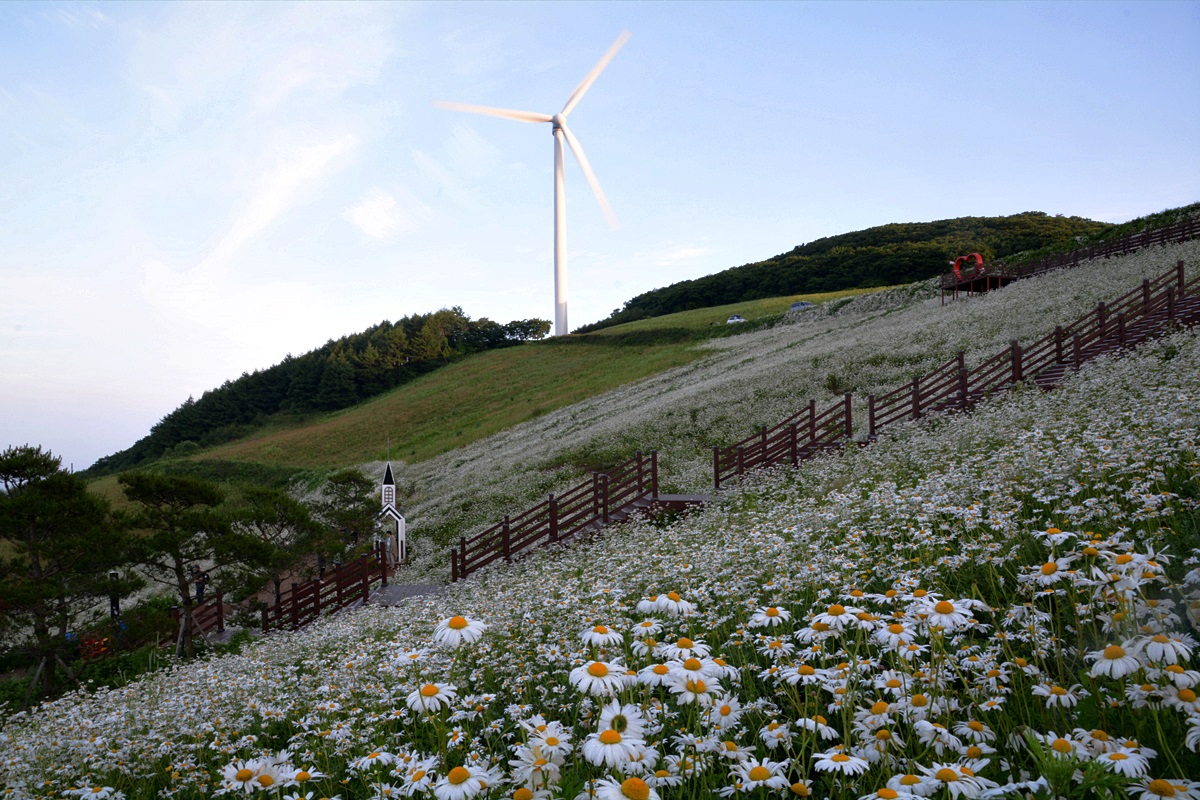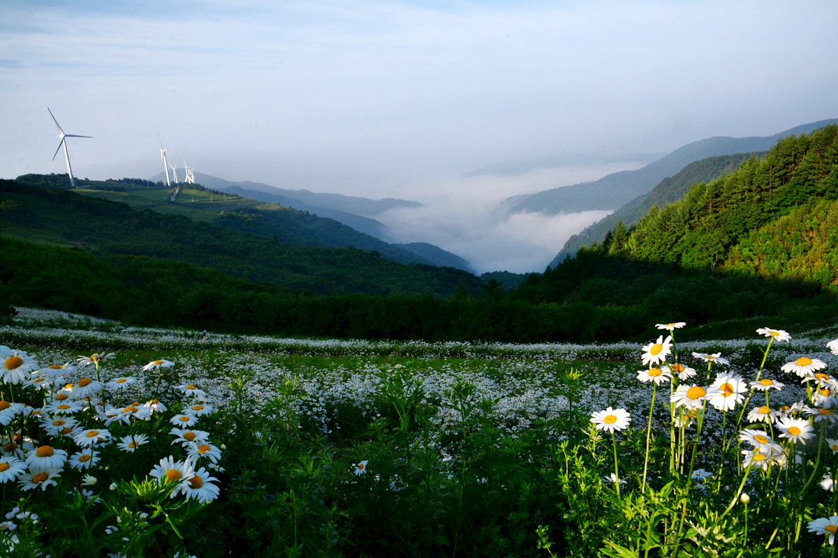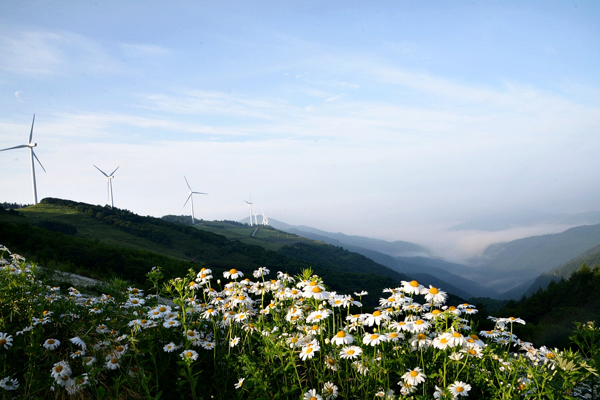 능선에 세워진 풍력발전기와, 운해와, 데이지꽃이 한데 어울어진 육백마지기 아침 풍경이 더없이 아름답다.