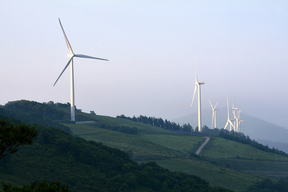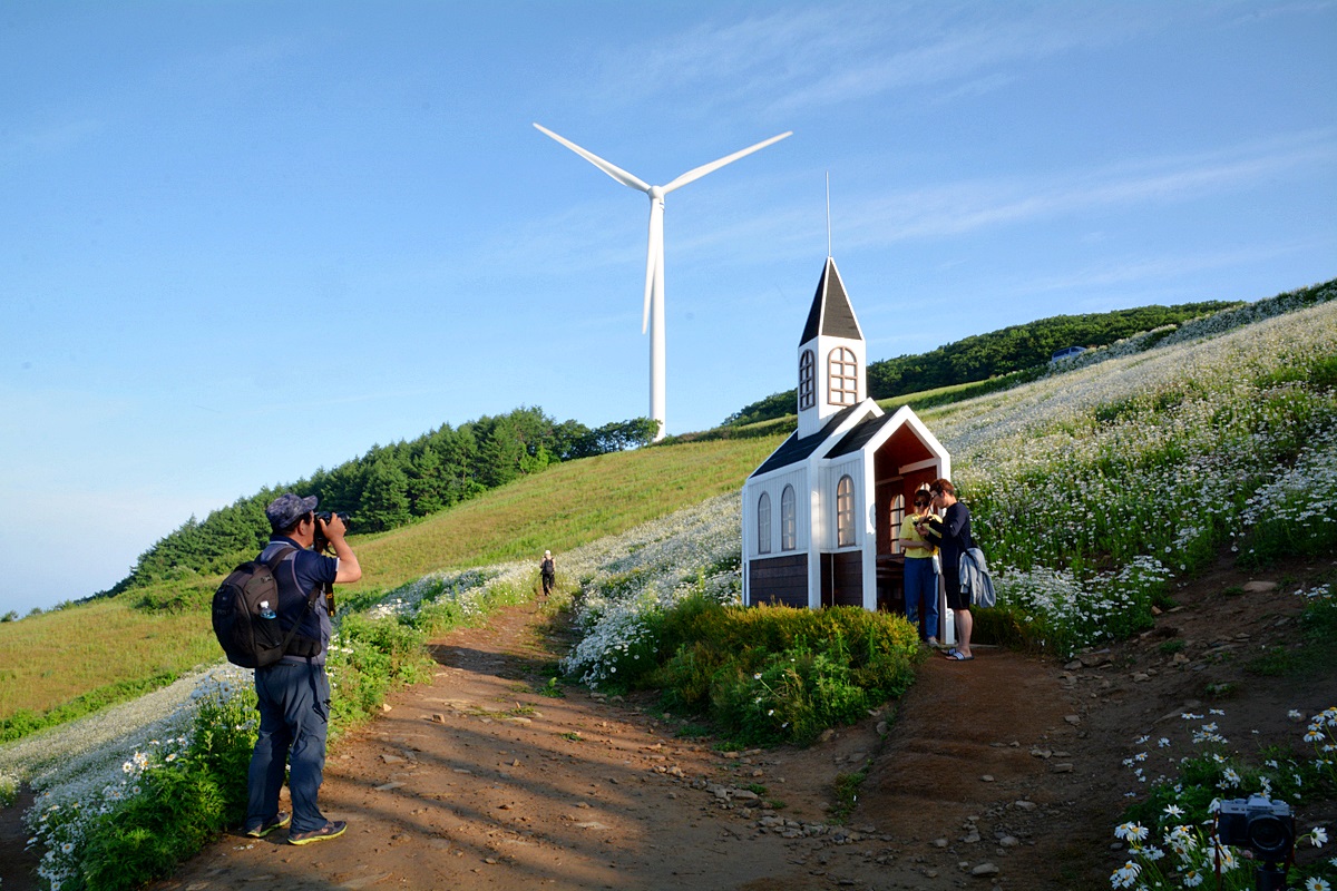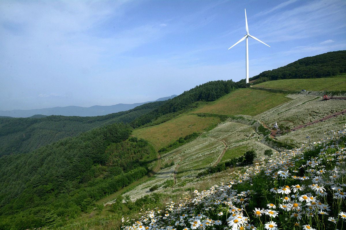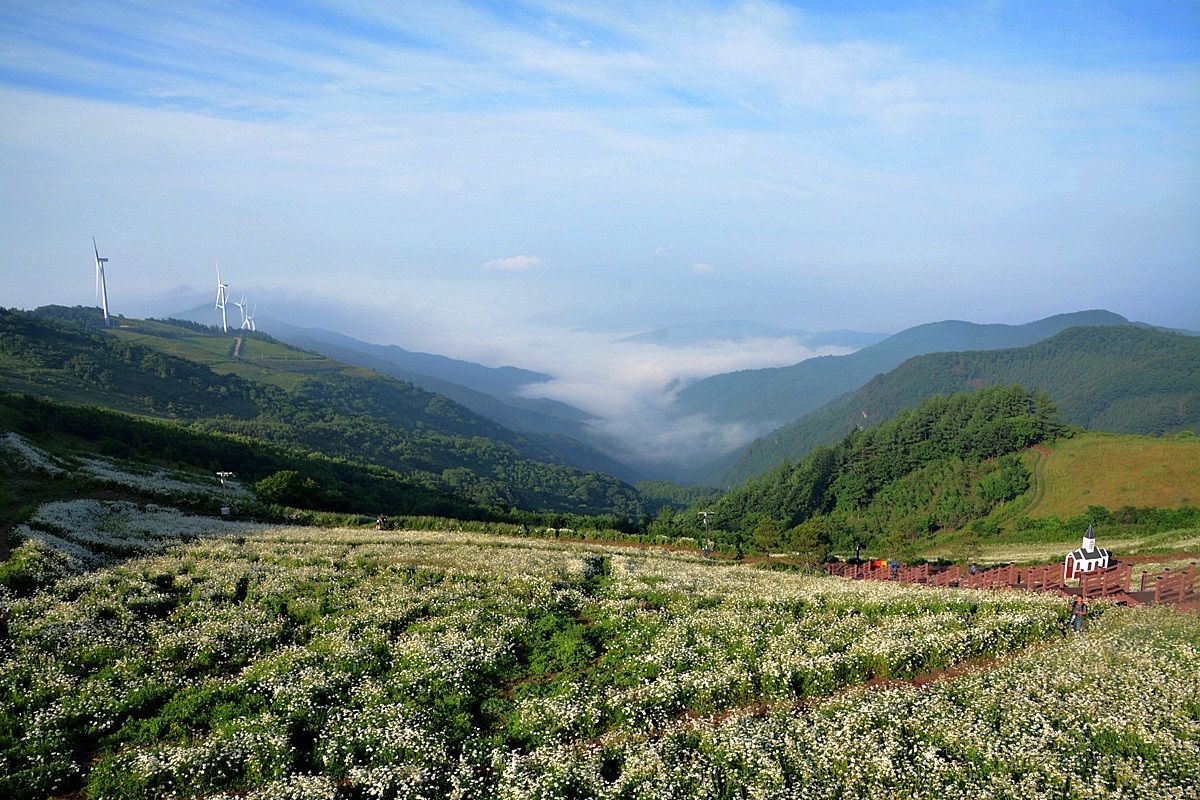 능선에 세워진 풍력발전기와, 운해와, 데이지꽃이 한데 어울어진 육백마지기 아침 풍경이 더없이 아름답다.
