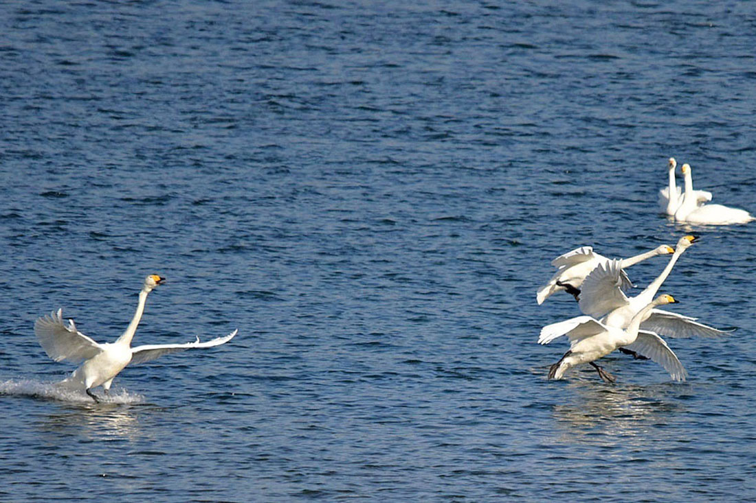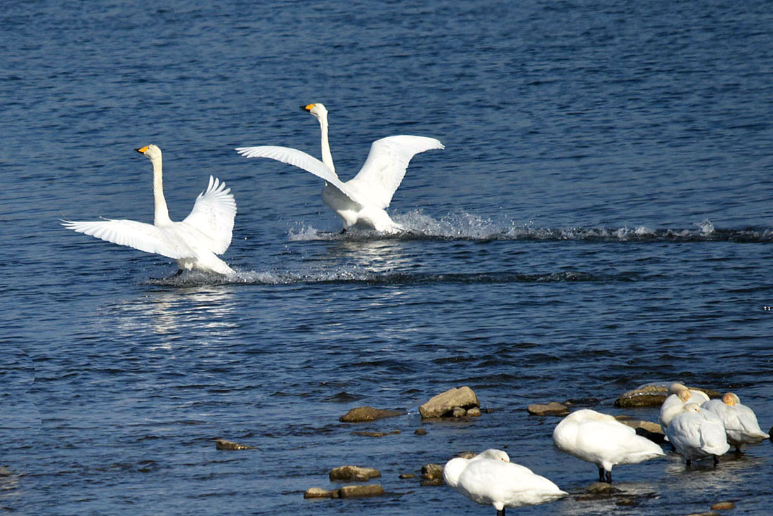 이제 본격적으로 월동을 시작하는 고니들의 몸짓이 제법 활발해지면 숫자도 늘고 간헐적으로 비상과 착수,
