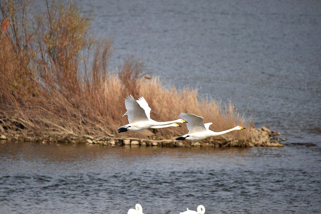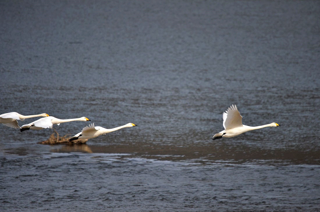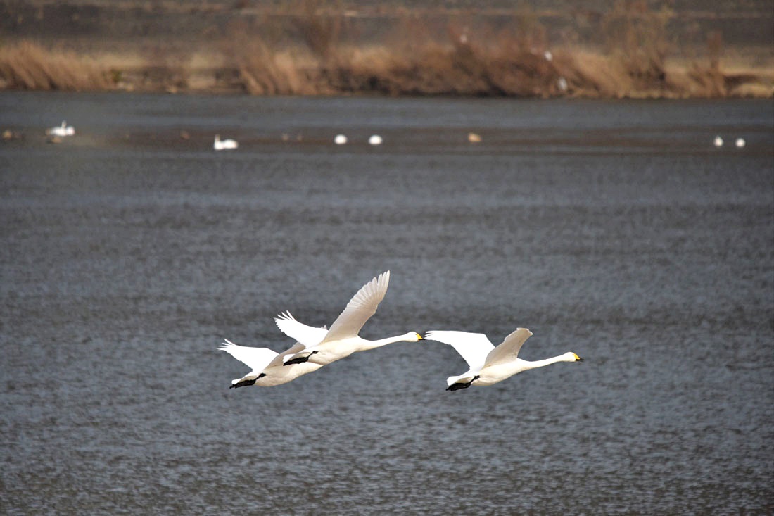 순간, 앗 떳다 소리와 함께 저 멀리서 대여섯 마리의 고니가 이쪽을 향해 나란히 날아오고 있다.