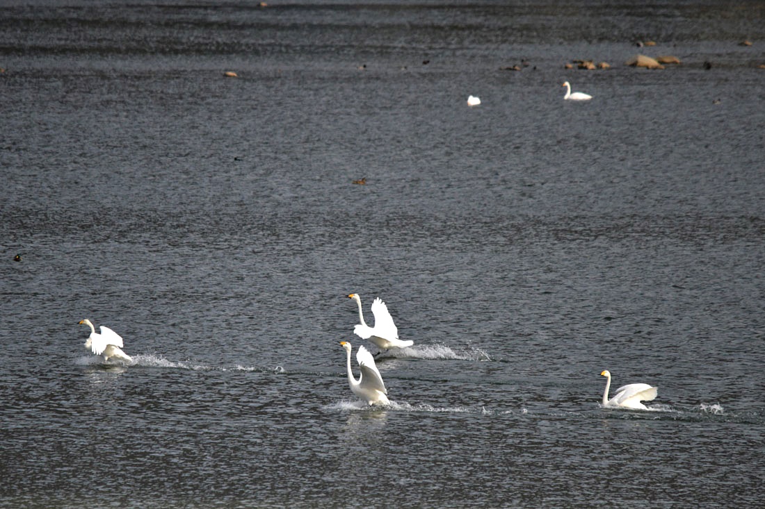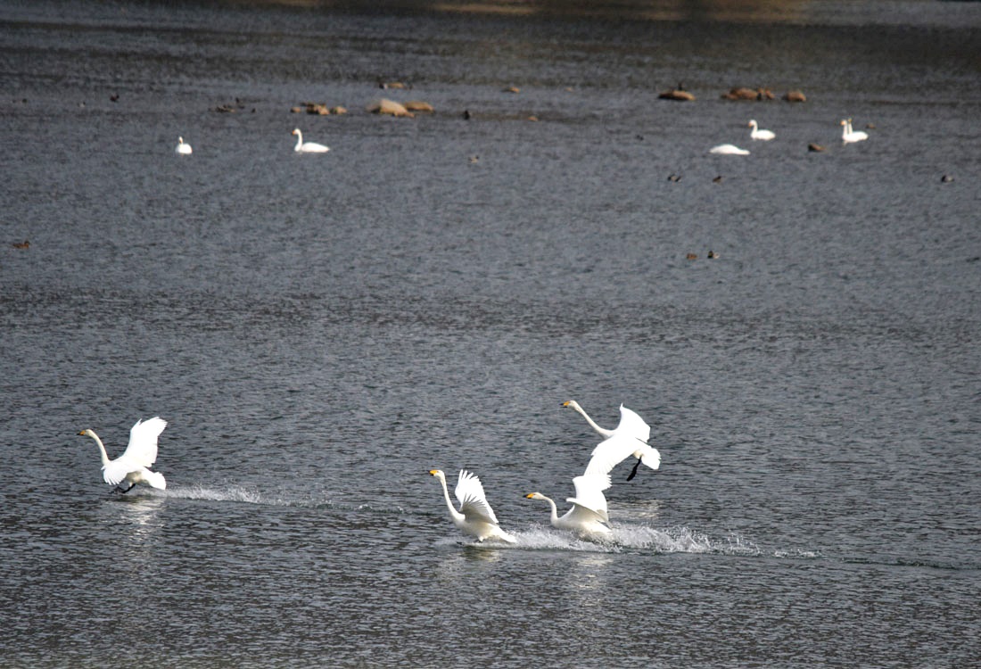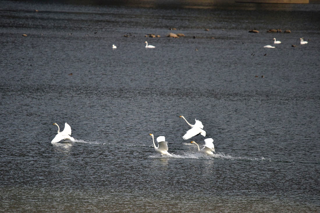 이제 본격적으로 월동을 시작하는 고니들의 몸짓이 제법 활발해지면 숫자도 늘고 간헐적으로 비상과 착수,