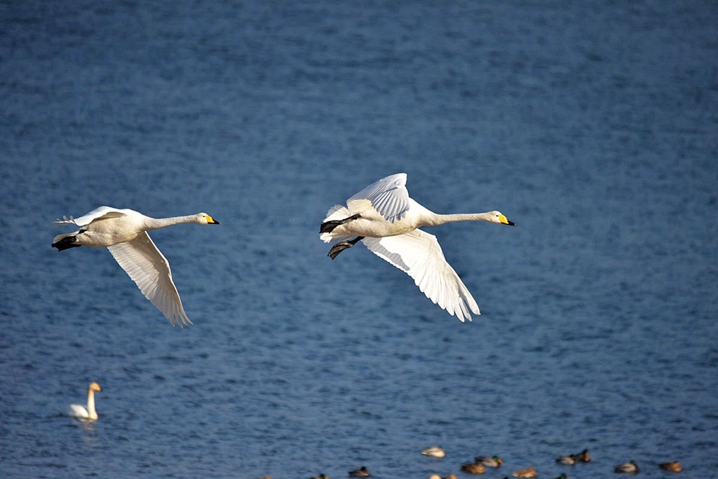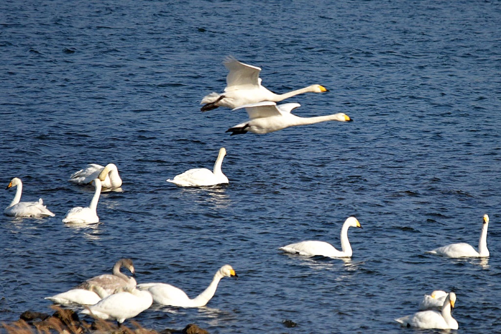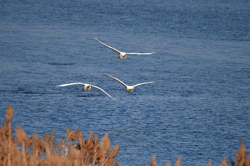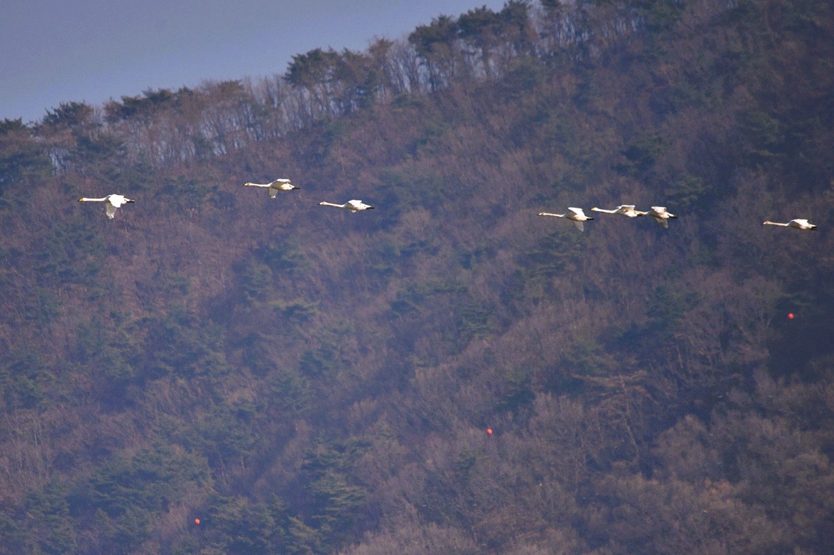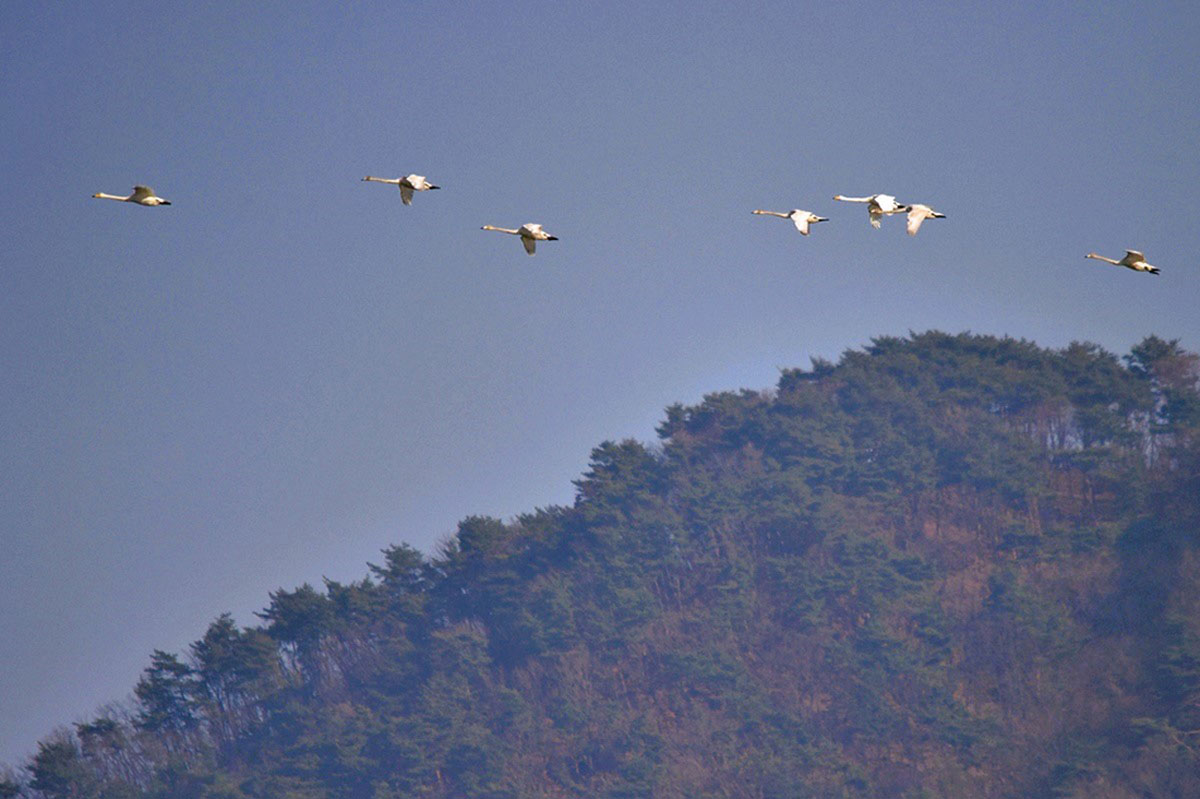 날아오는가 싶더니 또 저 멀리 맞은 편 시야에서 서너댓 마리의 고니가 이쪽을 향해 나란히 날아오고 있다.