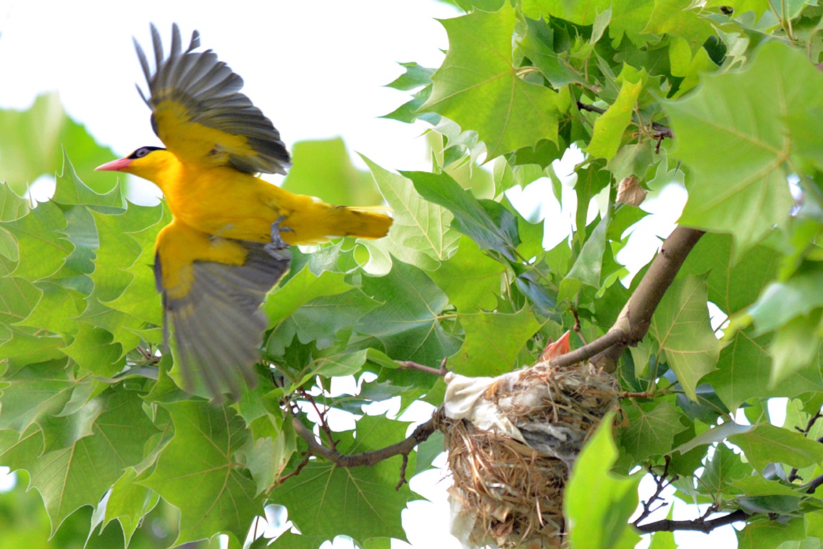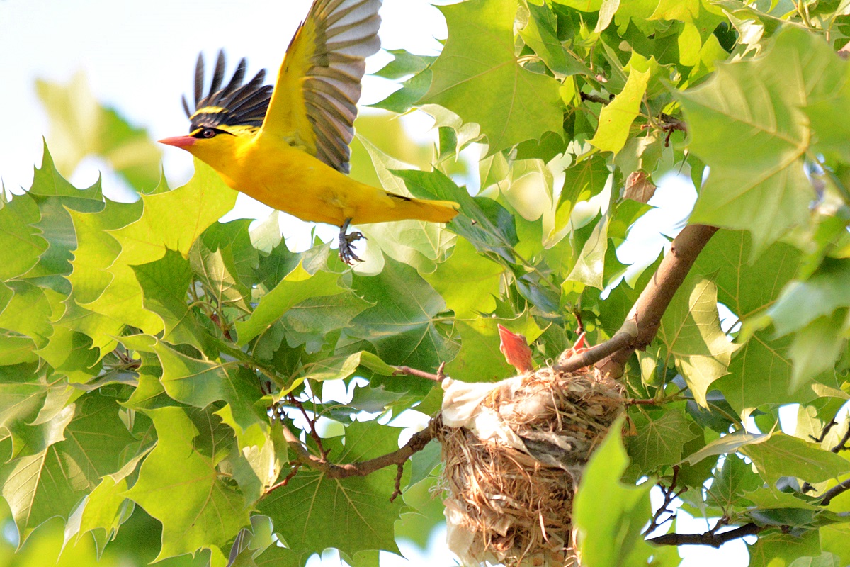 푸라타나스나무가 숲을 이루고 있는 지역, 나뭇잎이 무성한 작은 가지 깊숙히 보일듯말듯 꾀꼬리가 둥지를 틀고
