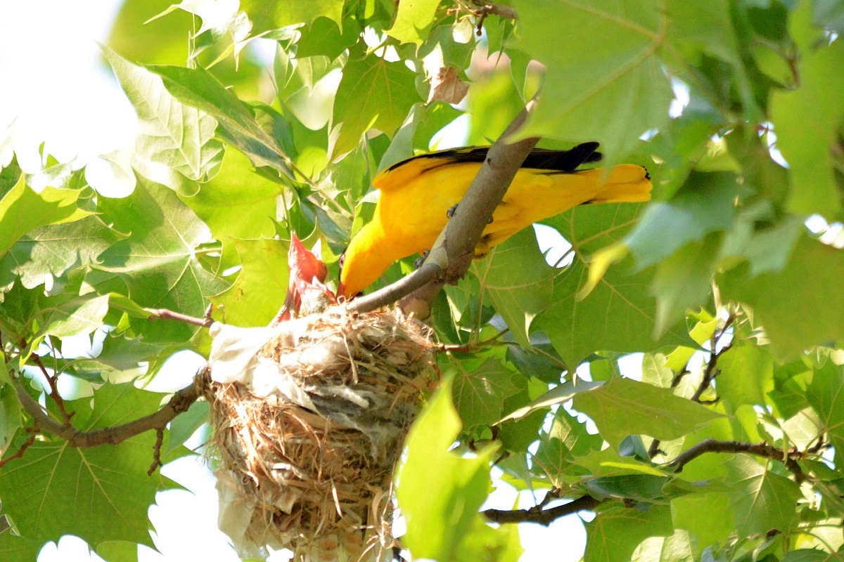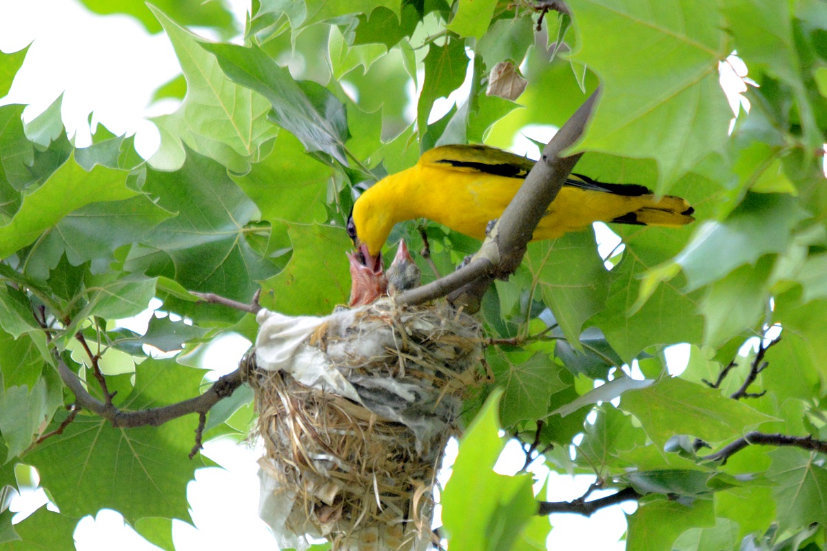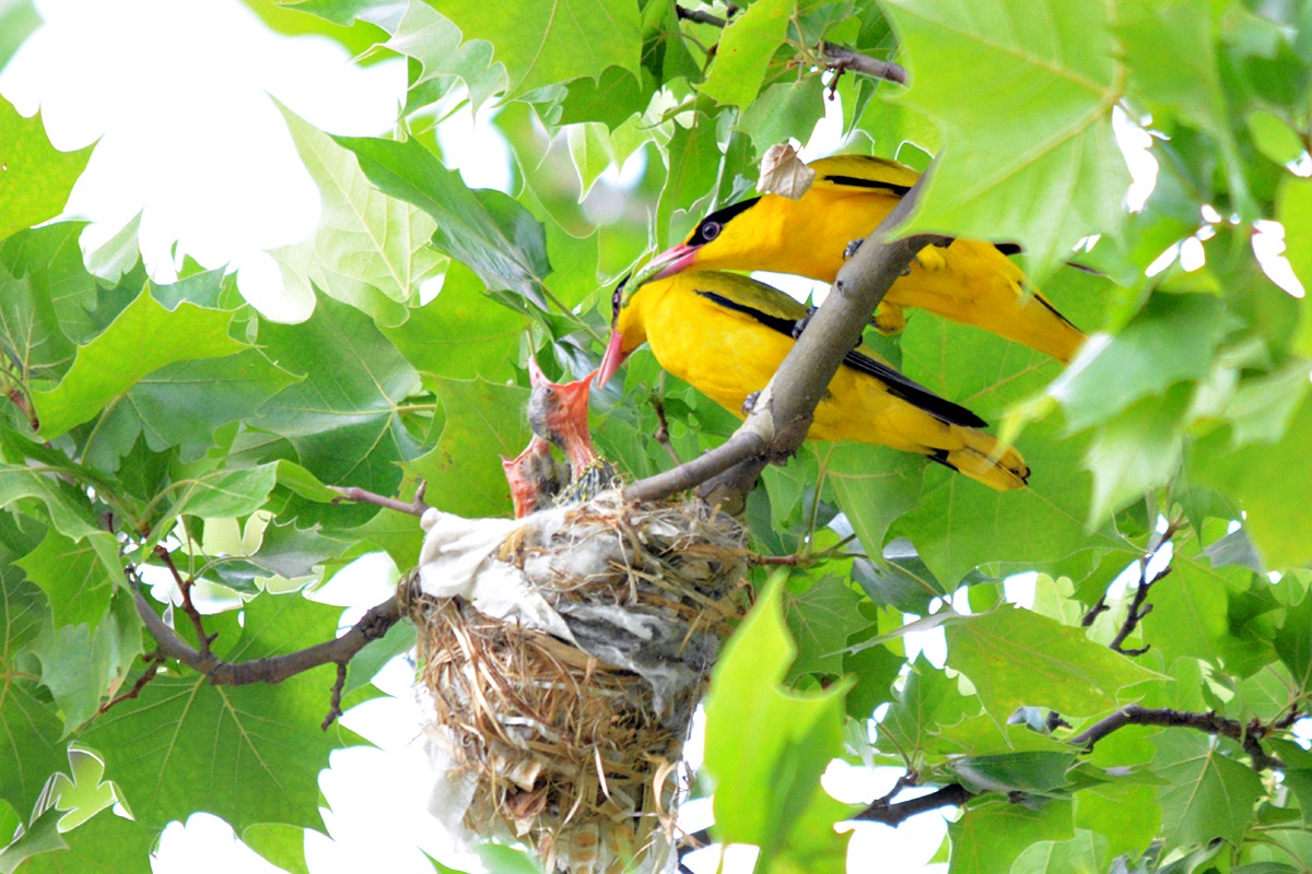 꾀꼬리 암 수 두 마리가 번갈아가며, 또는 두 마리가 동시에 부화해놓은 새끼에게 열심히 먹이를 물어나르고 있다