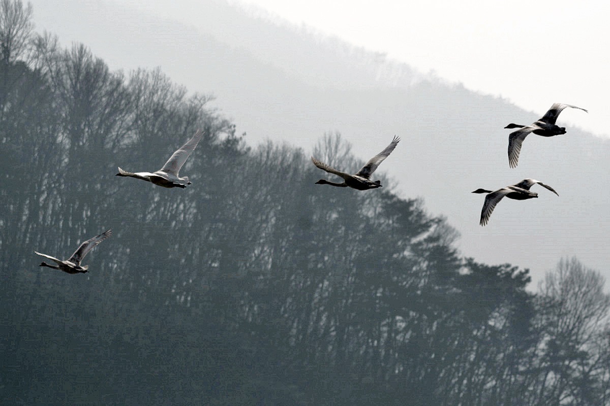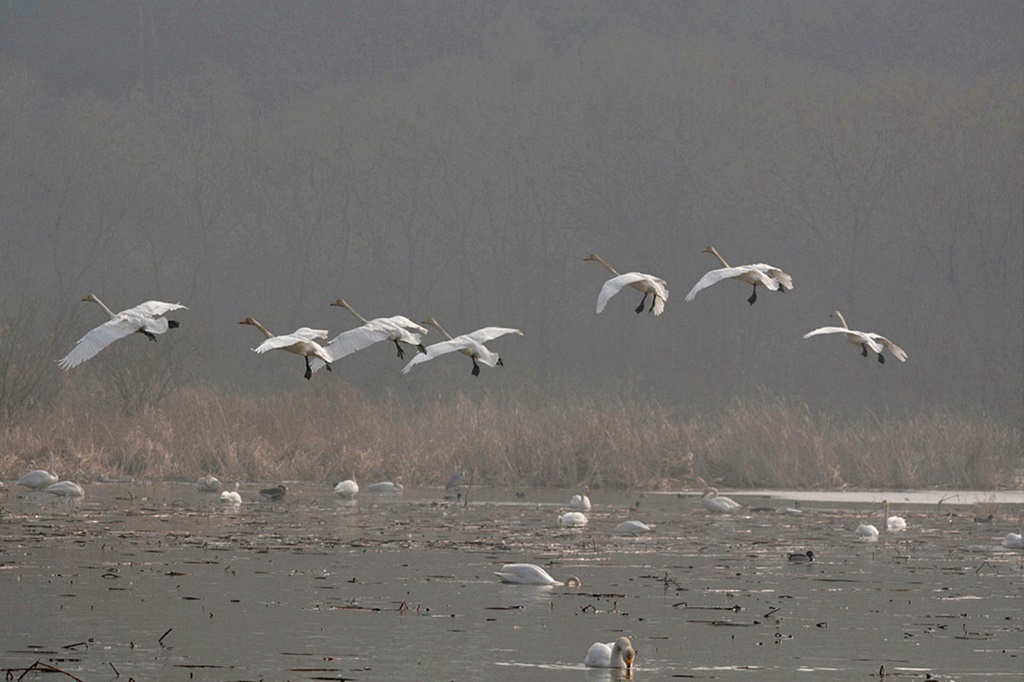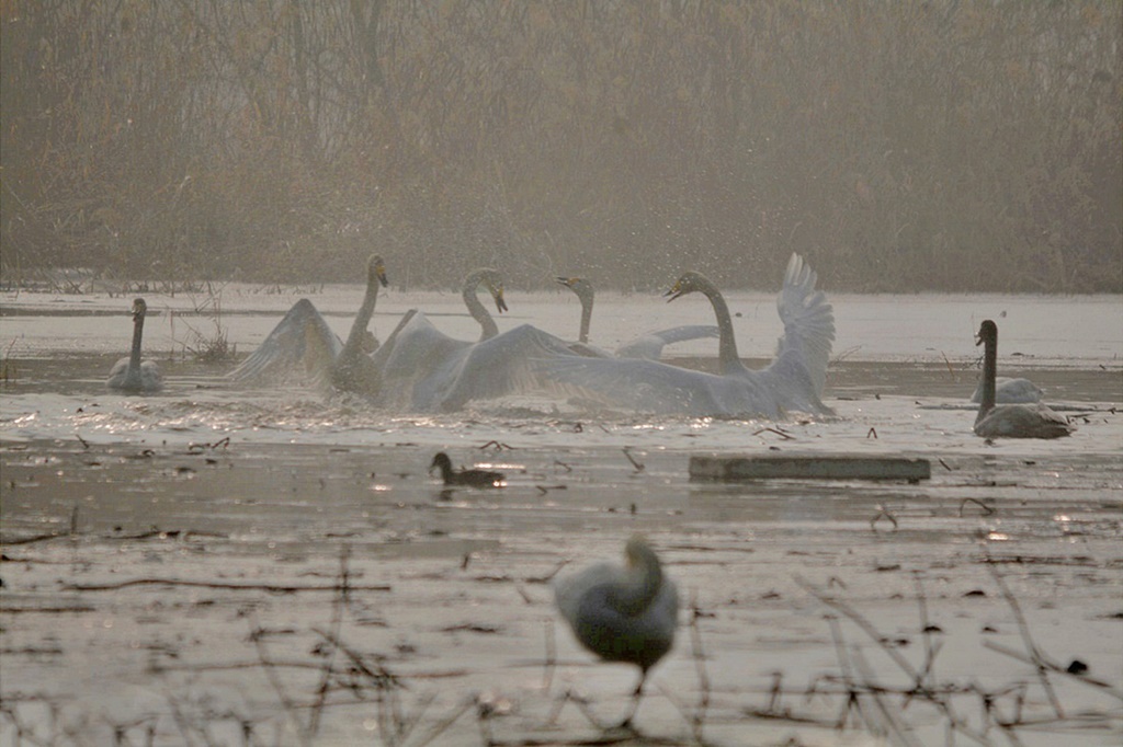 어디선가 갑자기 날아든 7~8 마리의 고니가 안개 자욱한 수면 위에 사뿐히 내려앉고 있다