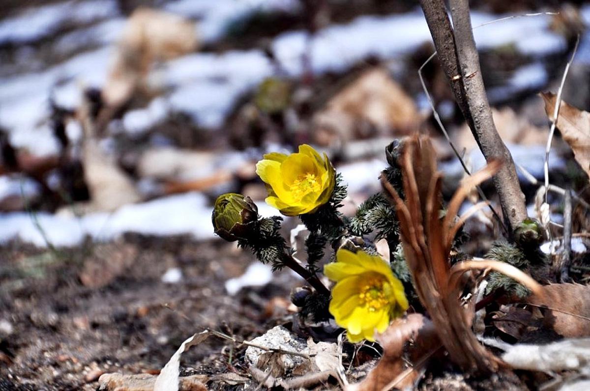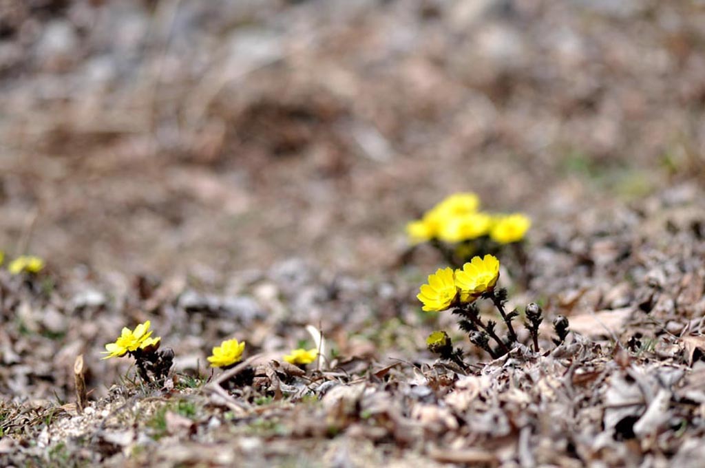 주변에는 아직 눈이 쌓여 있는데 복수초는 키 작은 가지 위에 노란 꽃을 피운다
