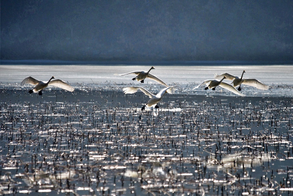 여기저기서 울려퍼지는 고니들의 힘찬 울음소리 속에 비상과 착수를 반복하는 활기찬 몸놀림이 역동적이다
