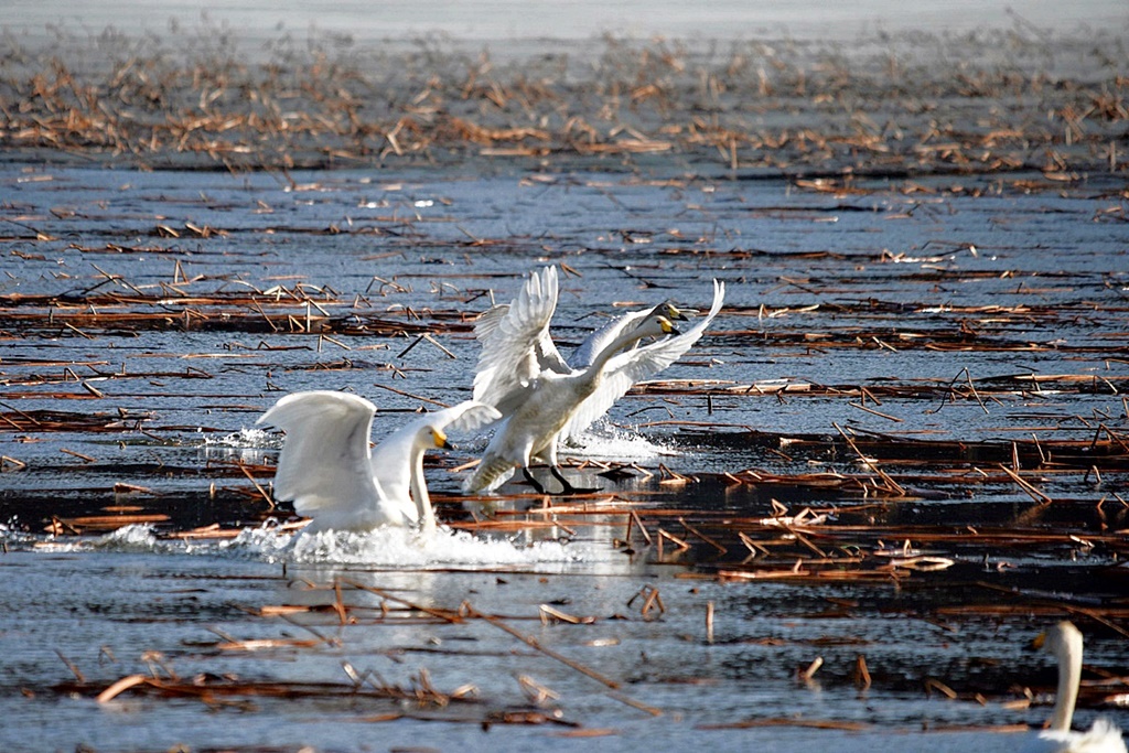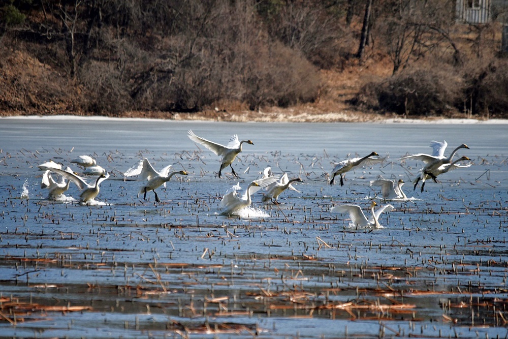 여기저기서 울려퍼지는 고니들의 힘찬 울음소리 속에 비상과 착수를 반복하는 활기찬 몸놀림이 역동적이다