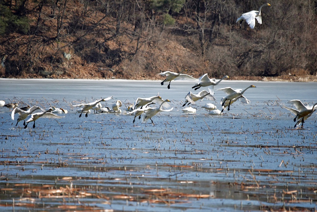 이 곳은 고니들의 겨울나기 서식지로 유명한 곳이지만 그동안 물이 완전히 결빙되어 고니들을 볼 수 없었는데