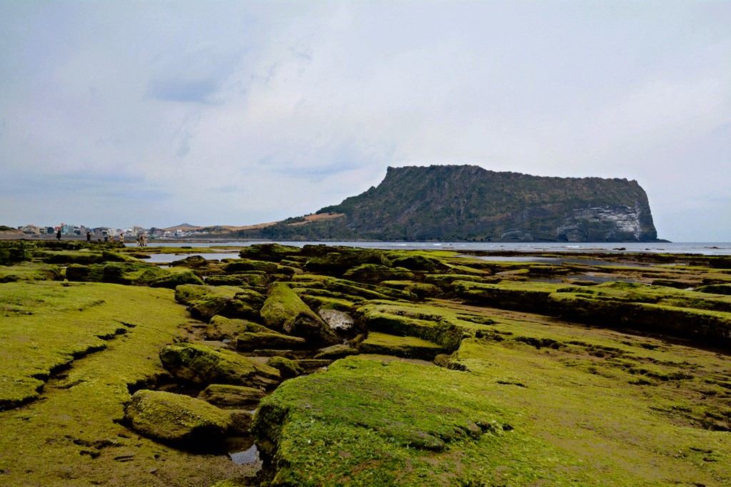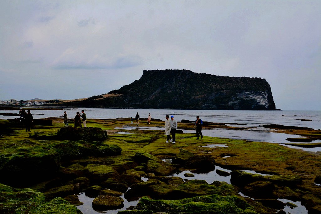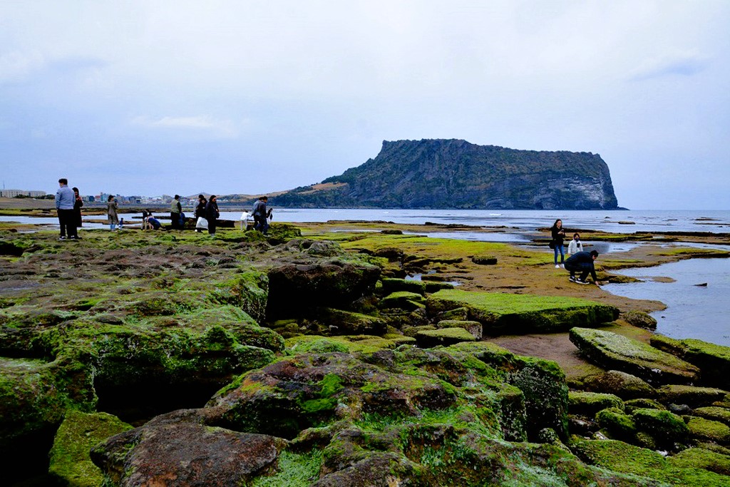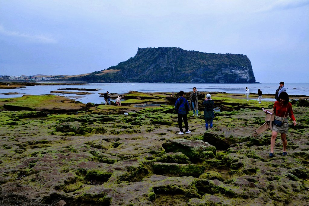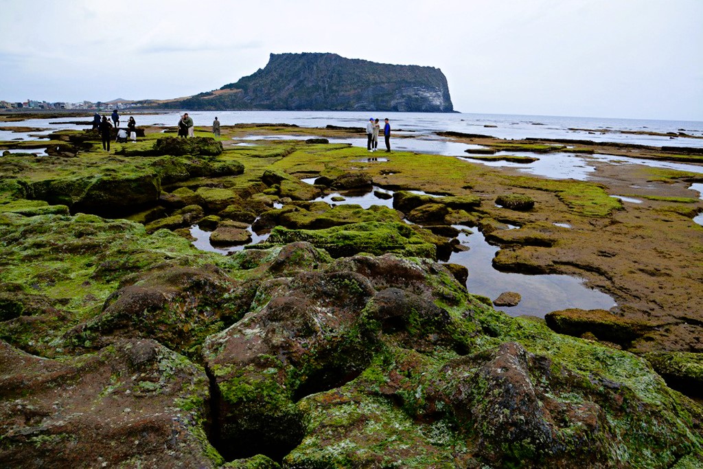 성산일출봉 앞바다 광치기해변, 해변가 암석 위의 이끼를 바탕에 깔고 사진을 촬영하는 것은