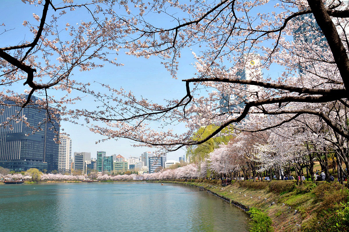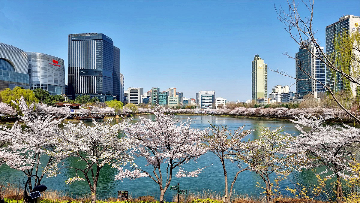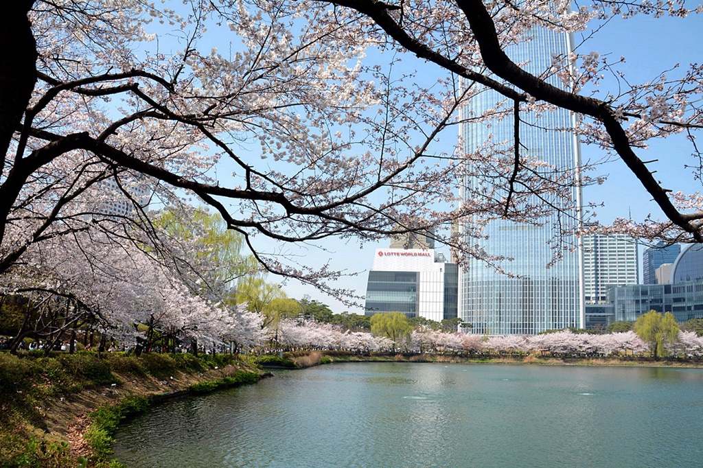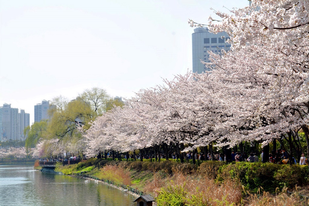 벚꽃 절정기의 석촌호수의 봄은 무척 아름답다. 금년은 예년에 비해 개화시기가 빠르다고 한다.