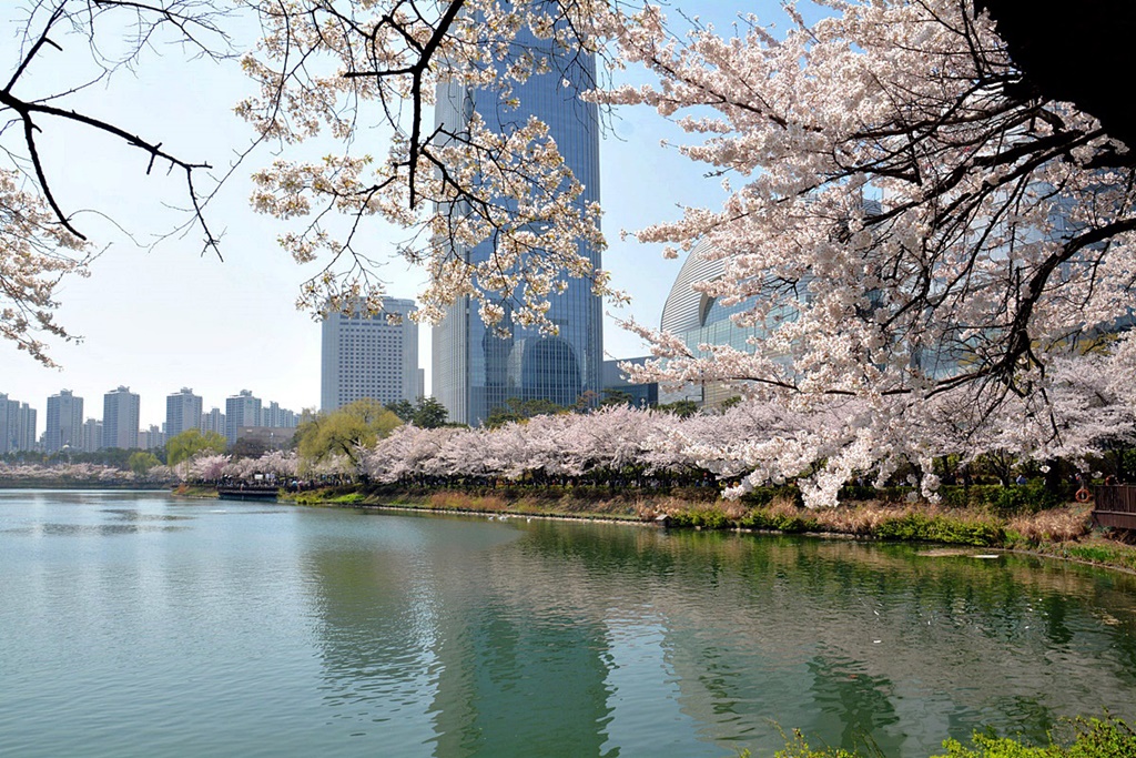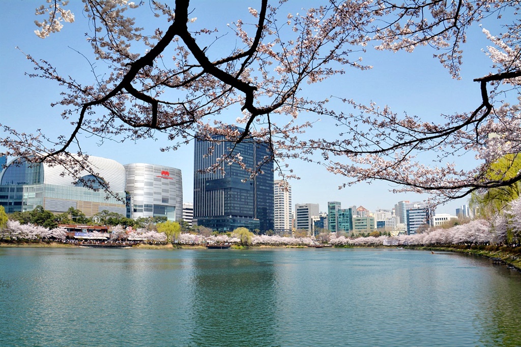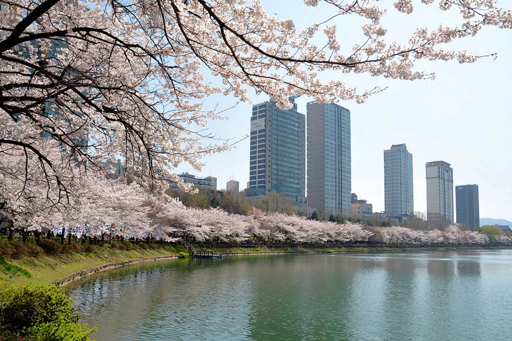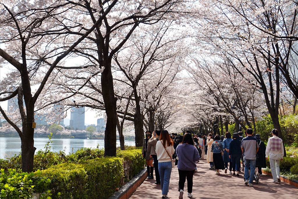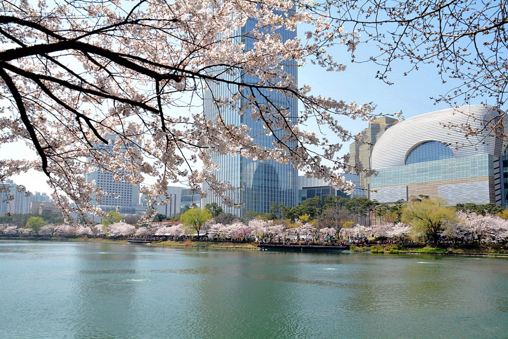 벚꽃 절정기의 석촌호수의 봄은 무척 아름답다. 금년은 예년에 비해 개화시기가 빠르다고 한다.