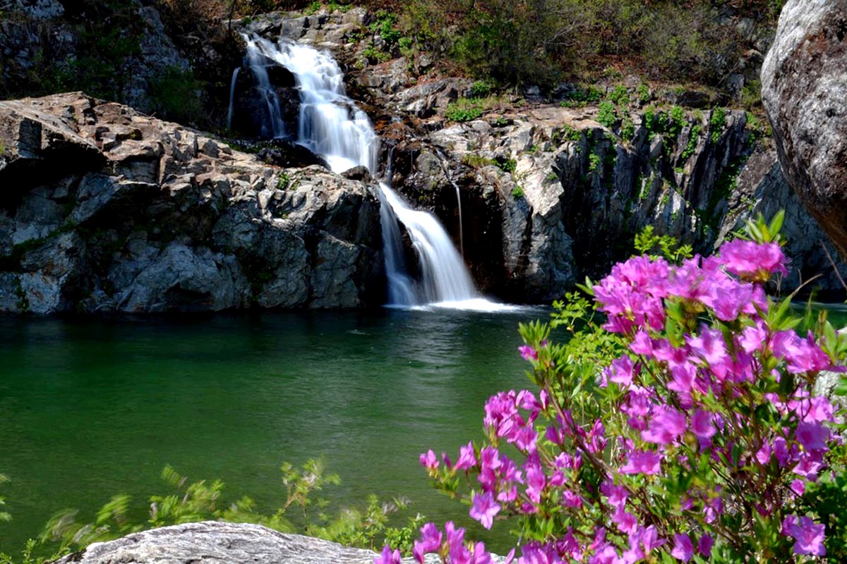 명지계곡의 용소폭포는 4월 수달래꽃 절정기에 꽃을 배경에 깔고 폭포 촬영을 하기 위해서