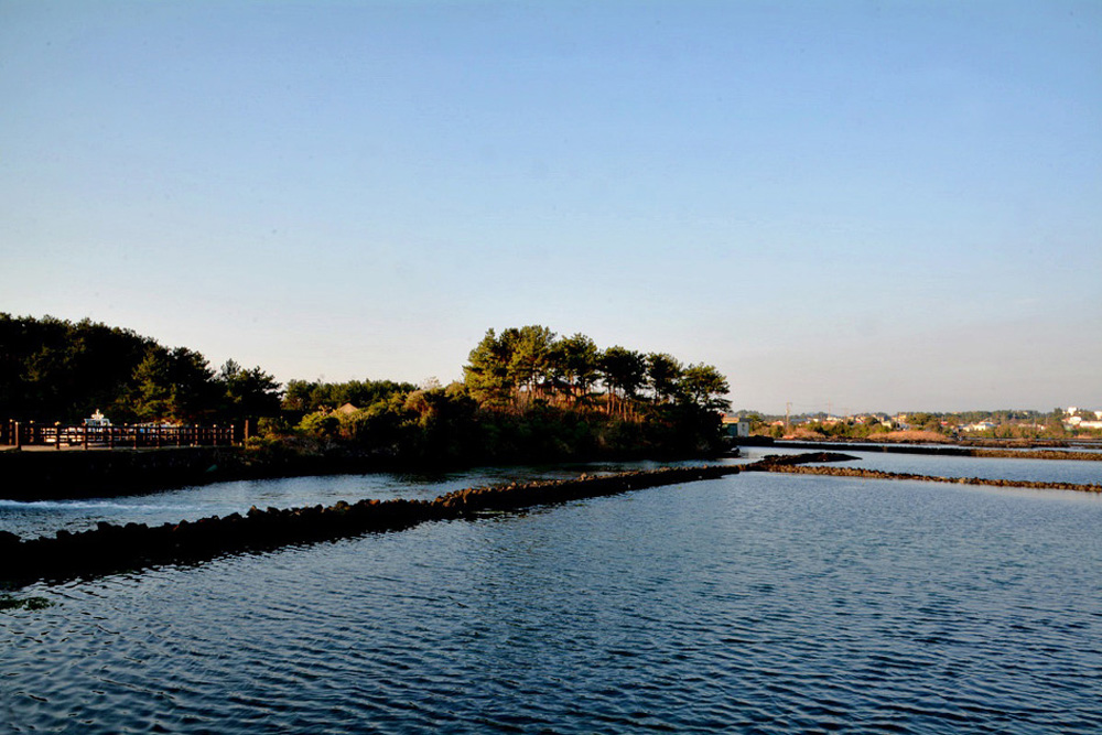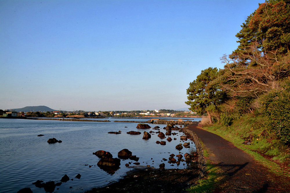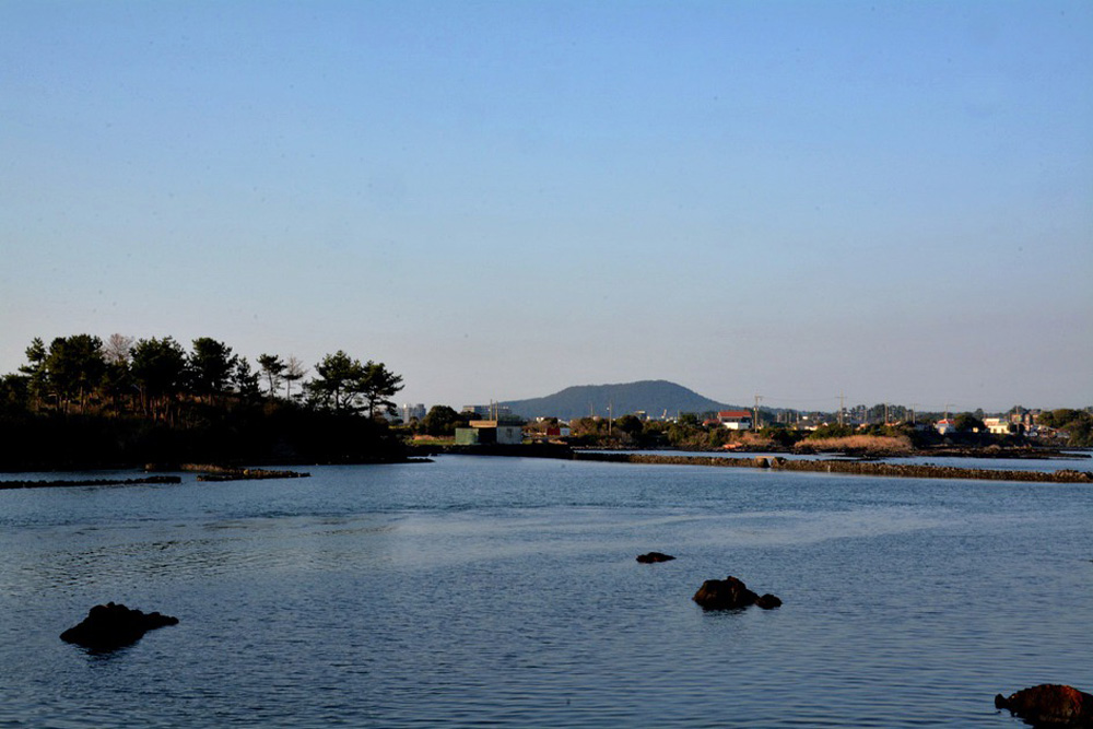 용천수(족지물)가 논 모양의 호수를 이루며 바다로 이어지고 있다.