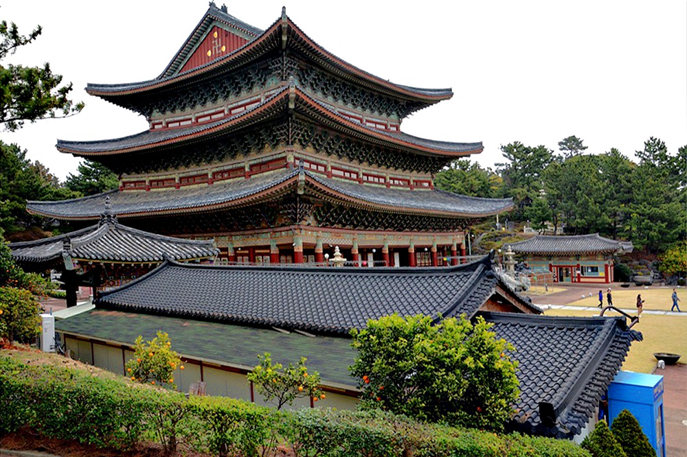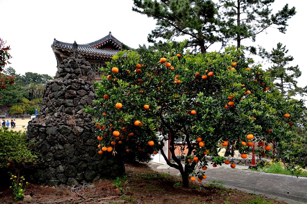 제주도 소재 사찰답게 경내에는 돌하르방이 많이 눈에 띄며 감귤나무가 정원수처럼 심어져 있어 이채롭다.