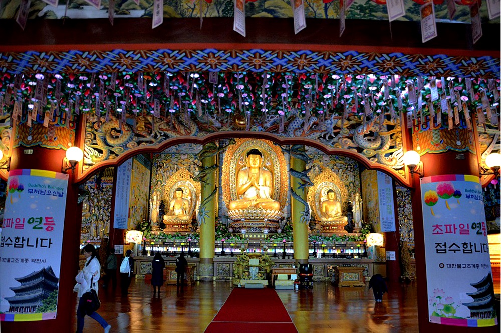 법당 내부 정면에는 국내 최대인 높이 5m의 주불인 비로자나불이 4m의 좌대 위에 안치되어 있고,