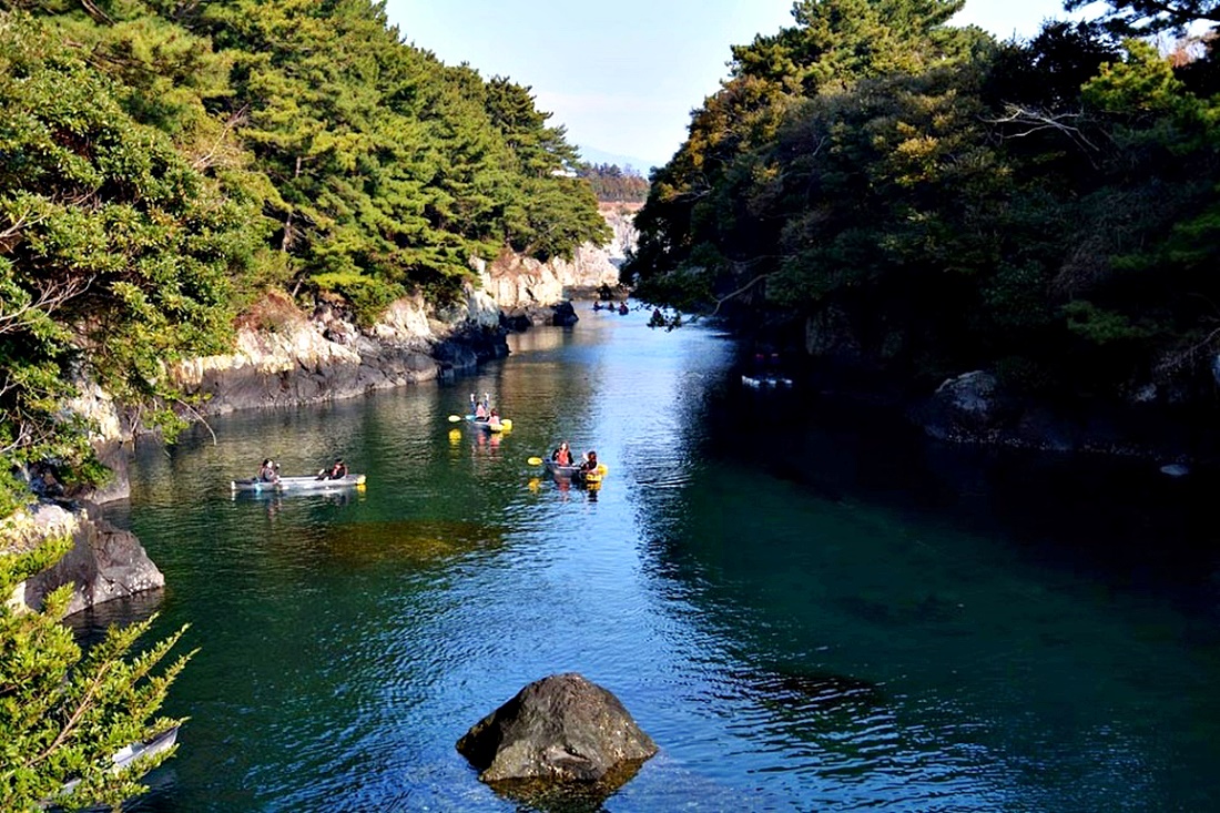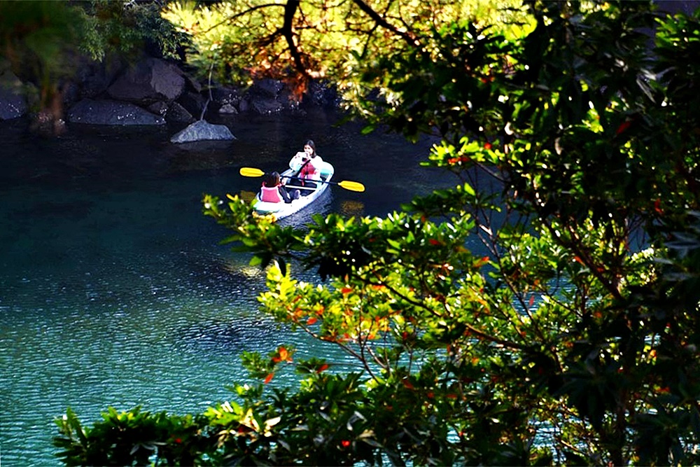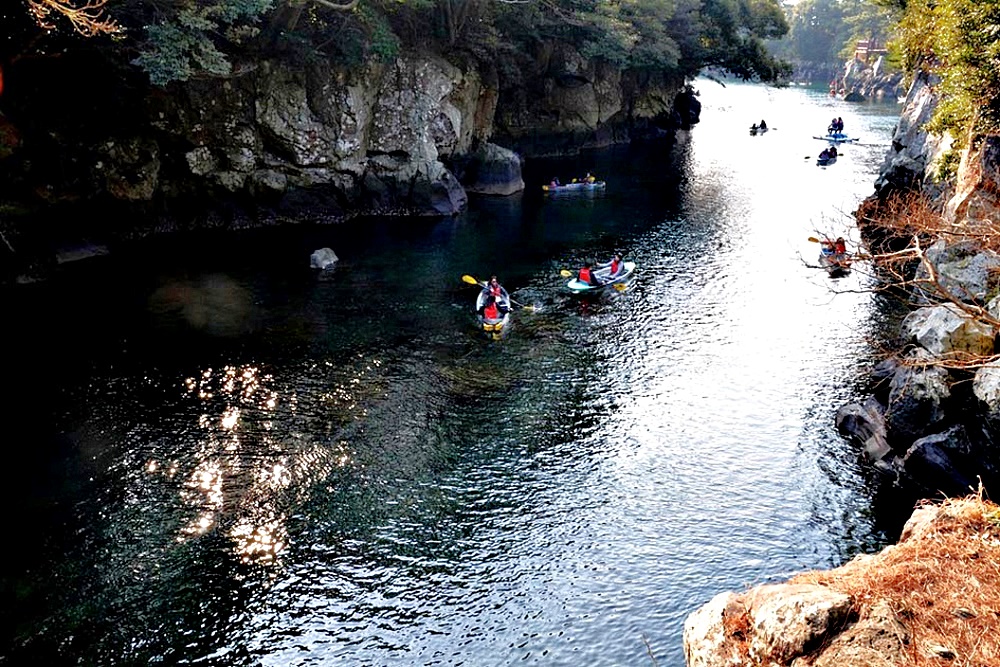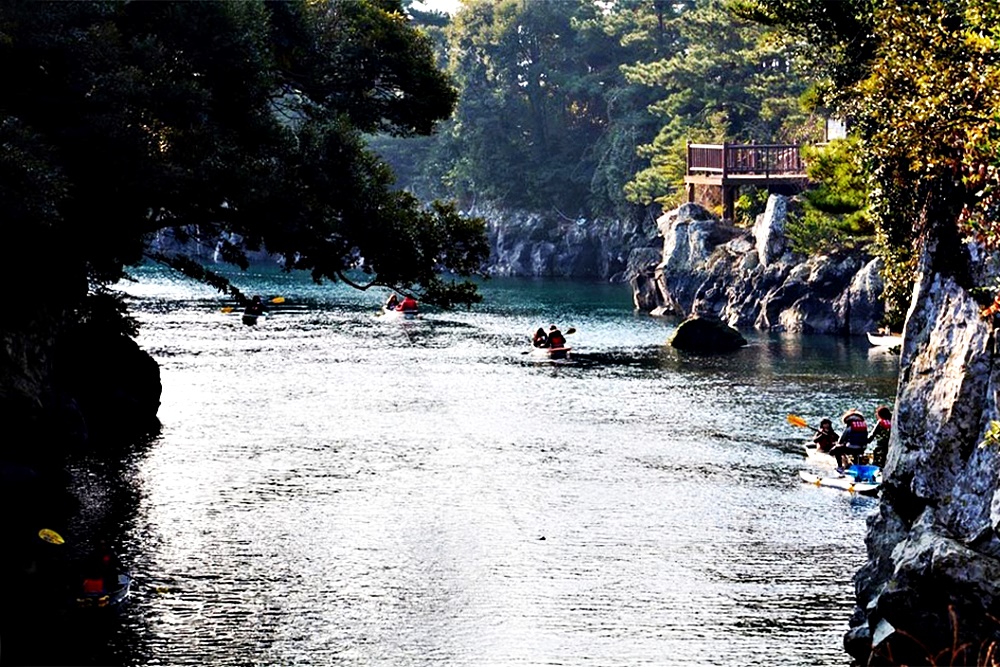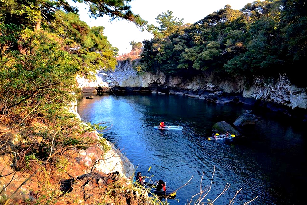 민물과 바닷물이 합쳐지는 수려한 계곡의 짙푸른 물 위엔 카약체험과 뱃놀이를 즐기는 관광객들의 표정이 무척 즐겁다.