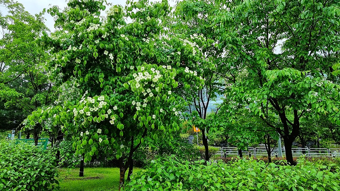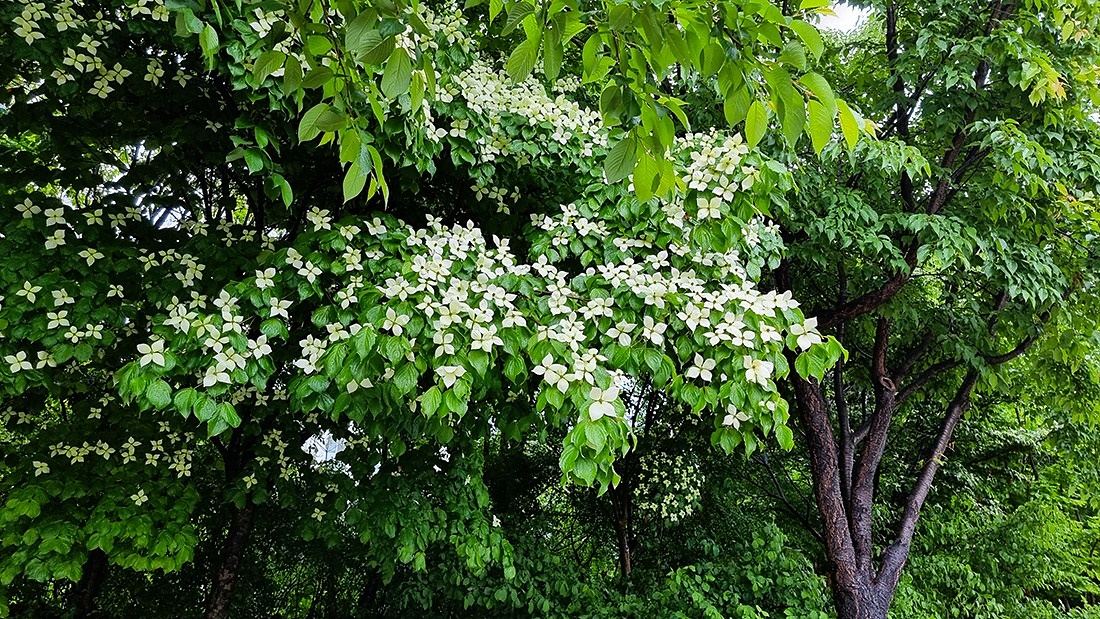 그러나 수많은 나무들이 펼치는 녹색의 정원에서 산딸나무는 새하얀 꽃으로 우리 눈에 금방 환하게 들어온다.