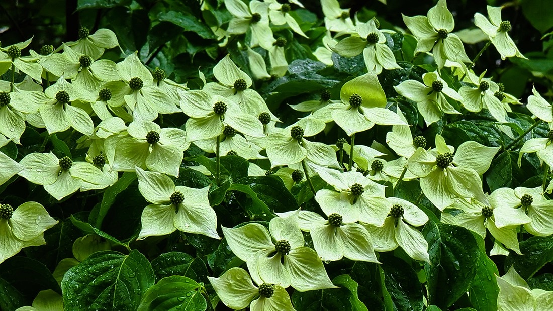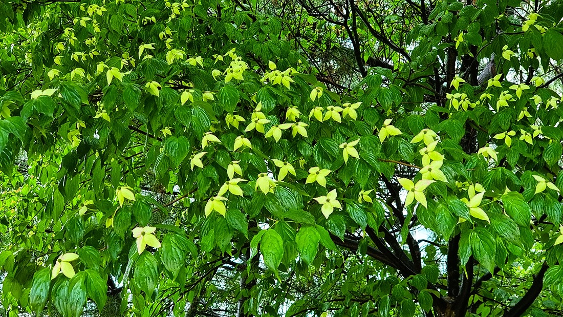 산딸나무 꽃은 네 장의 꽃잎이 마주보기로 붙어 있는 커다란 꽃이 수백 개씩 층층으로 피어 있다.
