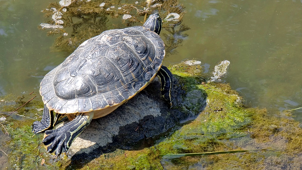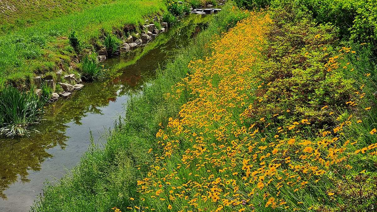 실개천엔 산란기를 맞은 잉어가 무리지어 퍼득이고 며칠 전엔 고라니, 오늘은 자라가 눈길을 끌며 생태계가 살아숨쉼을 말해주고 있다