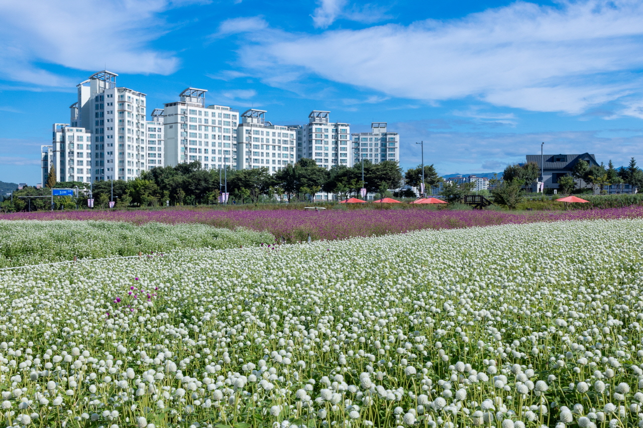 천일홍을 위주로, 사루비아, 코스모스, 구절초, 핑크뮬리, 댑싸리, 가우라, 칸나등도 보조출연을 하고 있다.