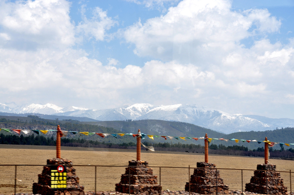 사방 어느 방향에서 보나 저 멀리 설산이 보이고 주변이 거의 목가적인 풍경으로 이 일대 거의 다가 아름다운